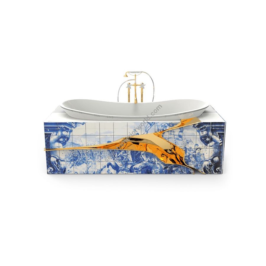 Heritage bathtub takes exceptional craftsmanship and design to a new realm. A statement bathtub covered in traditional hand-painted tiles, one of the most representative art forms of Portuguese culture, featuring a gold-painted tear finished with high gloss varnish. A sophisticated tub of high gloss black or white lacquered cast iron.