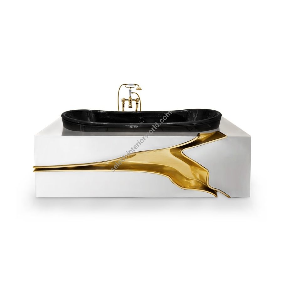 Black lacquered high gloss fiberglass with a sheet of stainless steel; Tub: High gloss black lacquered casted iron; Tear: Gold painted tears with high gloss varnish; Drainage: Floor