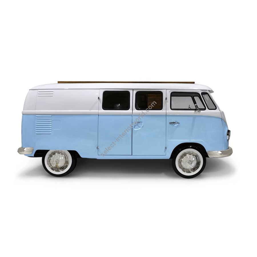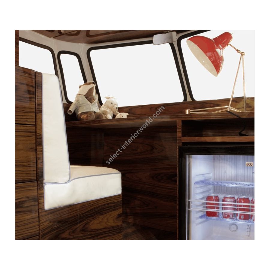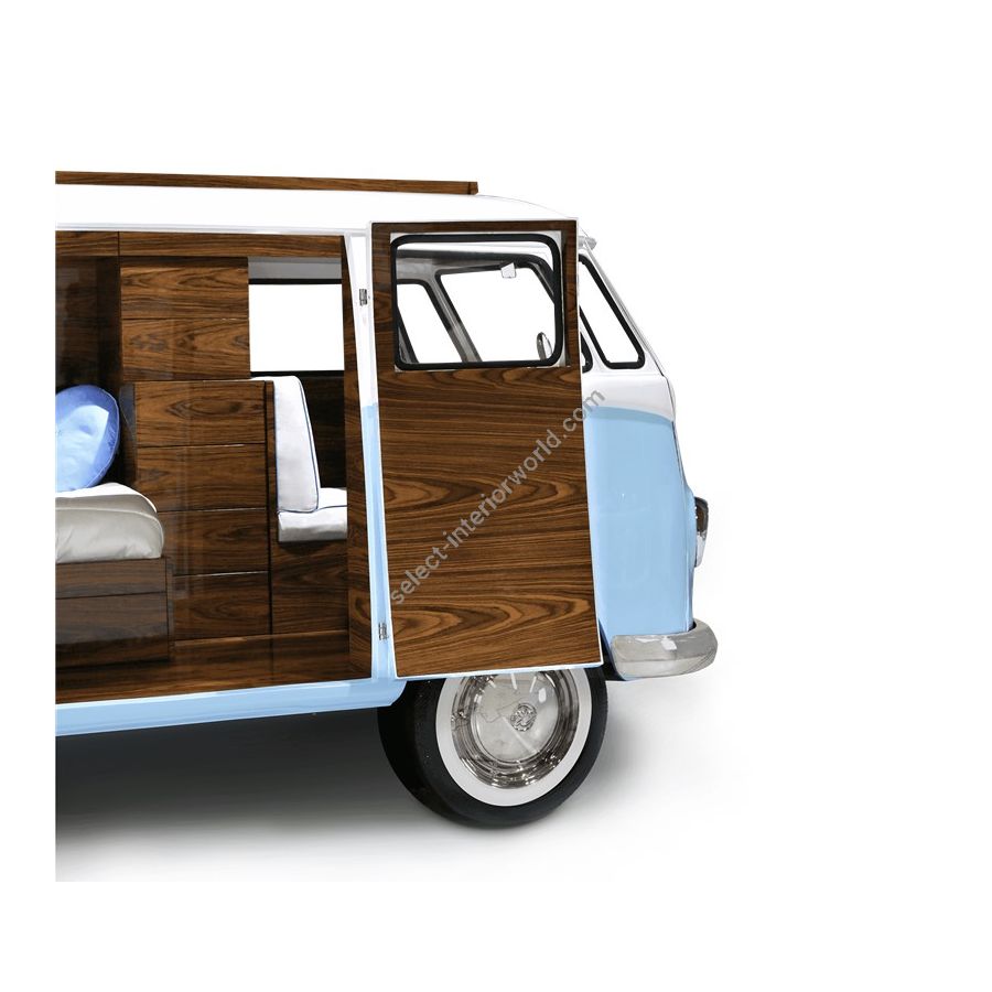 Bun Van is a unique kids bed inspired by the iconic 60’s camper van Fillmore from the Disney movie “Cars”. Is perfect to bring a total experience of fun and play to the children’s rooms. With the Bun Van, bedtime will be like an adventurous road trip. The exterior is produced in fiberglass with chrome-plated finishes and the inside is made of palisander wood veneer, containing several storage compartments, a bed, a TV, desk, mini bar and a sofa. It is a complete bedroom set for a children’s space.