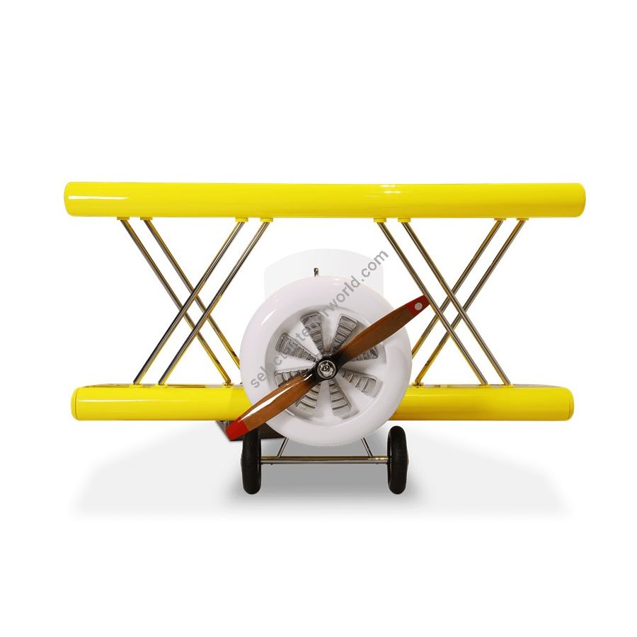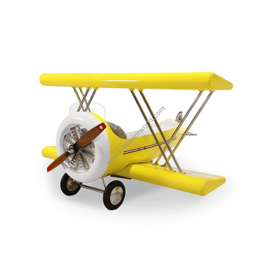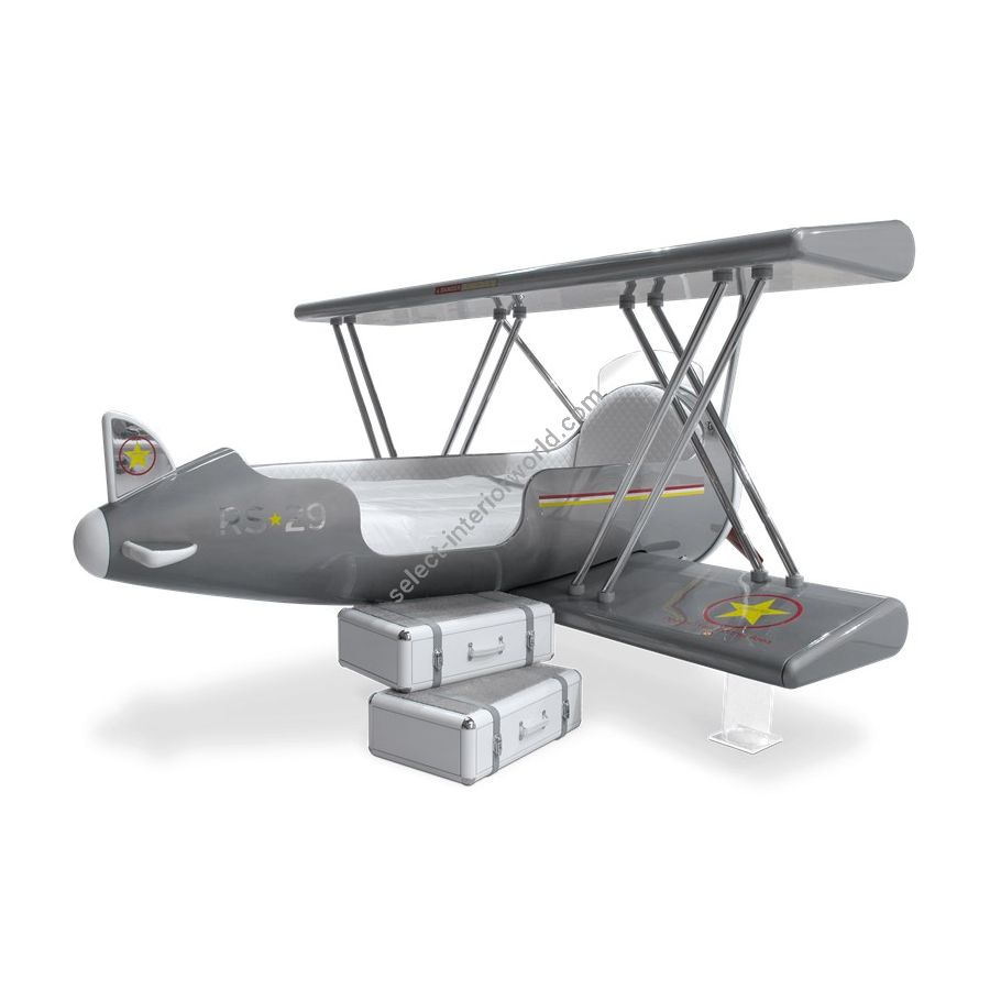 The Sky B Plane is an airplane kids bed with an aviation-inspired design that it’s meant to be educational and engaging. An airplane theme decoration for kids’ rooms is perfect to encourage the adventurous spirit of children.Inspired by kids’ fantasy world, they will easily relate this kids’ themed bed to the Disney movie “Planes” character Leadbottom, an iconic biplane wing aircraft used in the early years of aviation.The body is entirely made of fiberglass with glossy varnish applied and chrome plated finishes in the engine and wheels. The Sky B Plane has several storage compartments and the top wing is designed to be used as a bookshelf. The decorative suitcases include secret storage compartments and allow an easy access to the bed.