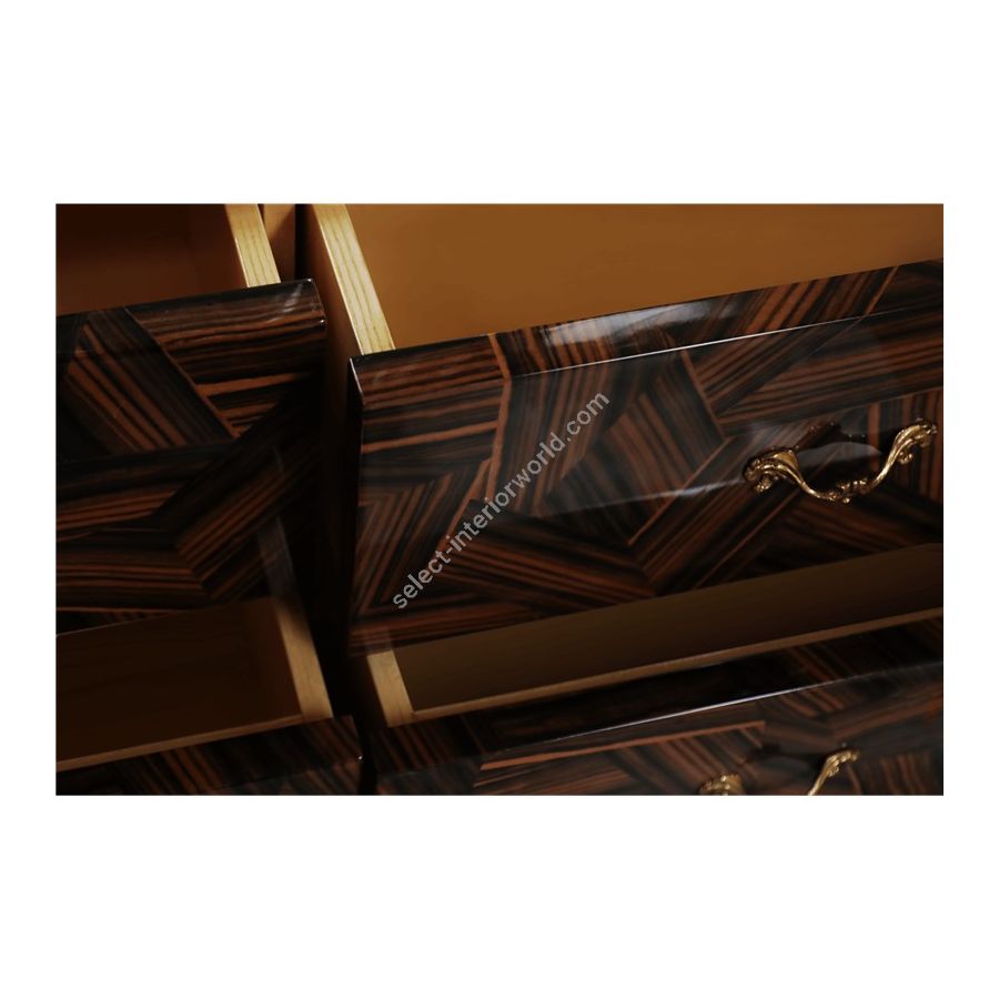 Base: handcrafted mahogany wood with a high gloss varnish finish. Book matched wood veneer of rosewood finished with a high gloss varnish. Body/Legs: High gloss colored lacquer in black or white. Doors and drawers of ebony veneer finished with a high gloss varnish. Brass handles, Glass shelves. The interior’s back is lined with mirror that contains polished ornaments in the glass