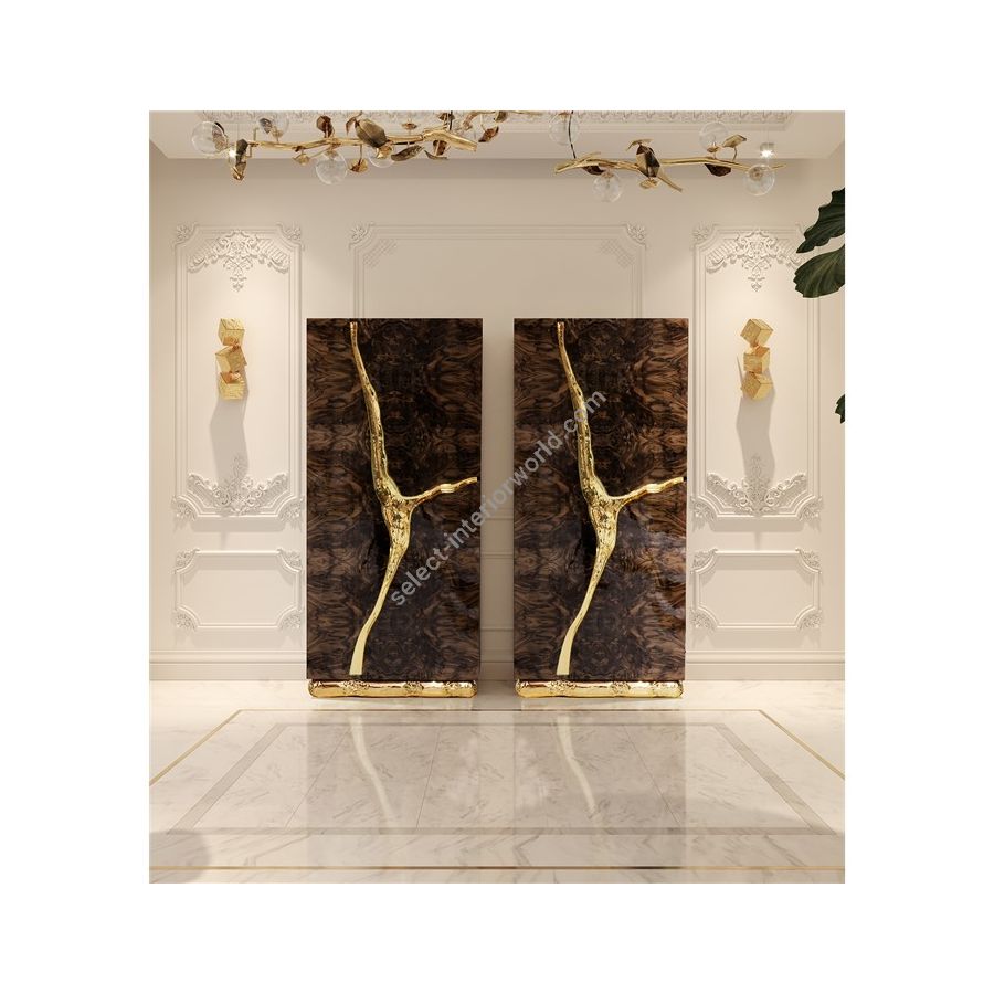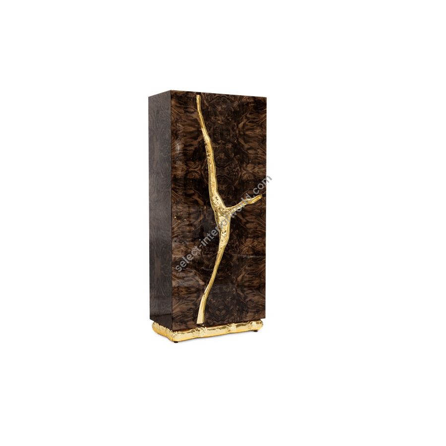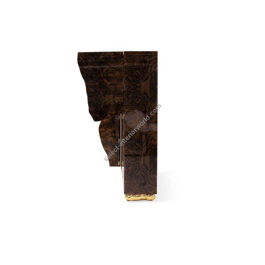 Lapiaz cabinet takes exceptional craftsmanship and design to a new realm. Finding beauty in the most unexpected places, this contemporary design piece is inspired by authentic karst formations. Its organic features are achieved through the manual fitting of polished brass, and a sharp finish in walnut wood veneer that portrays a perfect mirror. Different-shaped doors and drawer open to a distinct poplar root wood veneer interior. The hammered gold details and the mirrored façade conveys both dynamics and elegance, a beautiful duality between power and refinement to bring a new contemporary verve into interior design. A functional artwork piece born from cold and freshly cracked to showing off the world rich, golden details.
