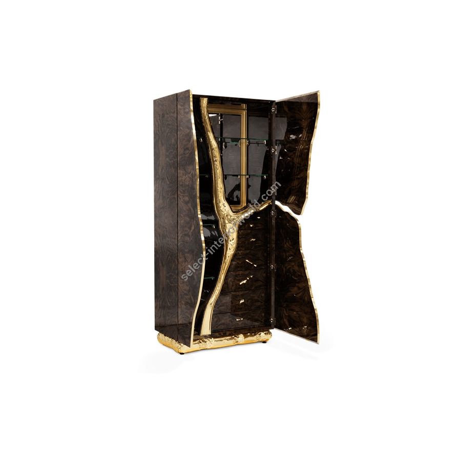 Coated exterior in walnut root veneer and gold finishes in hammered polished brass. Interior in Poplar Root & Polished Brass. Features 3 doors, 6 drawers, 6 glass shelves.