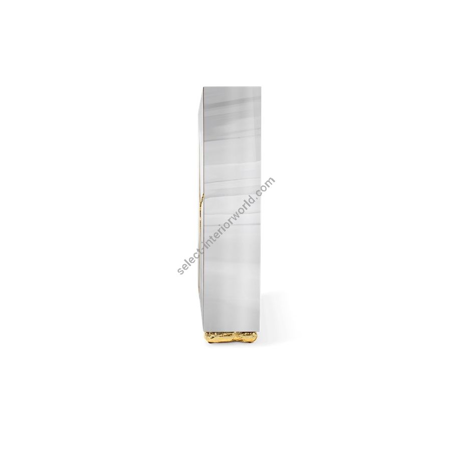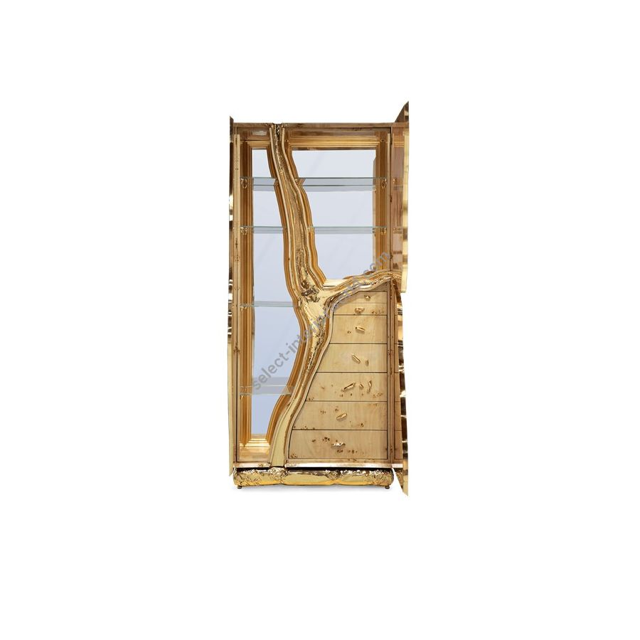 Lapiaz cabinet takes exceptional craftsmanship and design to a new realm. Finding beauty in the most unexpected places, this contemporary design piece is inspired by authentic karst formations. Its organic features are achieved through the manual fitting of polished brass, and a sharp finish in polished stainless steel that portrays a perfect mirror. Different-shaped doors and drawer open to a distinct poplar root wood veneer interior. The hammered gold details and the mirrored façade conveys both dynamics and elegance, a beautiful duality between power and refinement to bring a new contemporary verve into interior design. A functional artwork piece born from cold and freshly cracked to showing off the world rich, golden details.