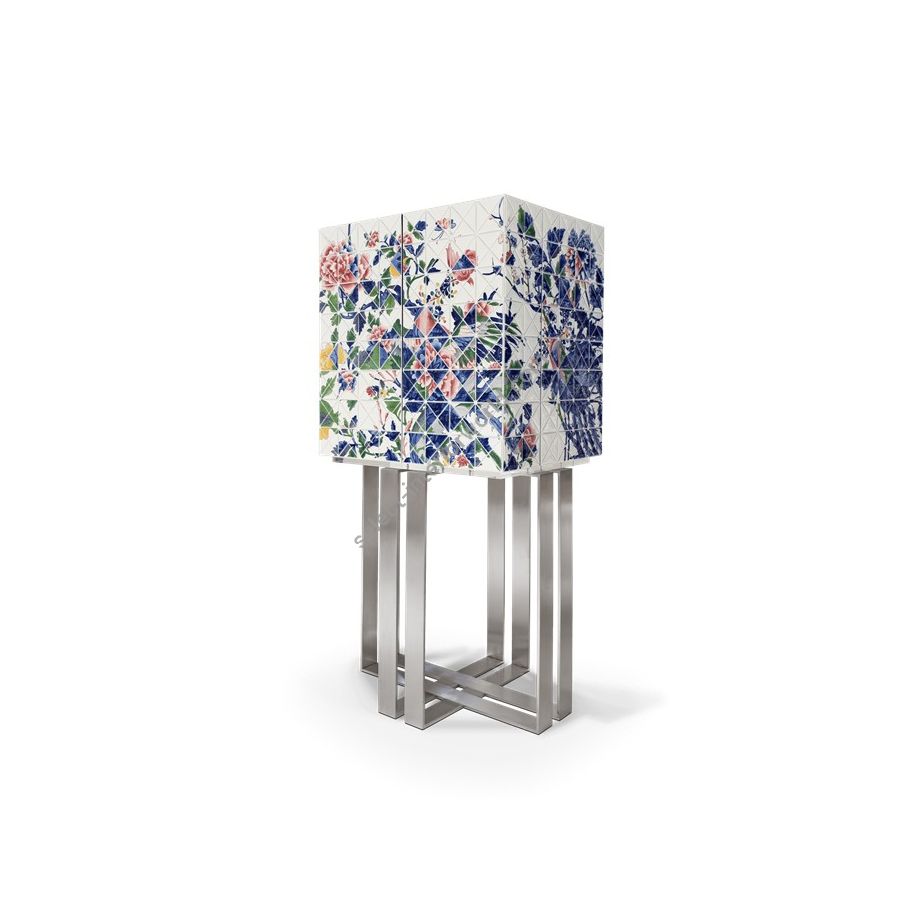 The elegant bar cabinet is covered by 1090 small porcelain triangles, 741 of which are hand-painted by the Vista Alegre manufacturing team. Precious floral and colorful details in shades of blue, pink, yellow, and green, that took 500 work-hours of the most skilled master artisans. A garden full of Paeonia flowers, where mythic Chinese birds live. Two upholstered doors in blue velvet fabric open for a mirrored storage space with three interior small drawers. The geometrical base in brushed steel gives this statement piece a unique and sophisticated character. One-of-a-kind piece for those who appreciate the exclusive design, daring the next generation to own it.