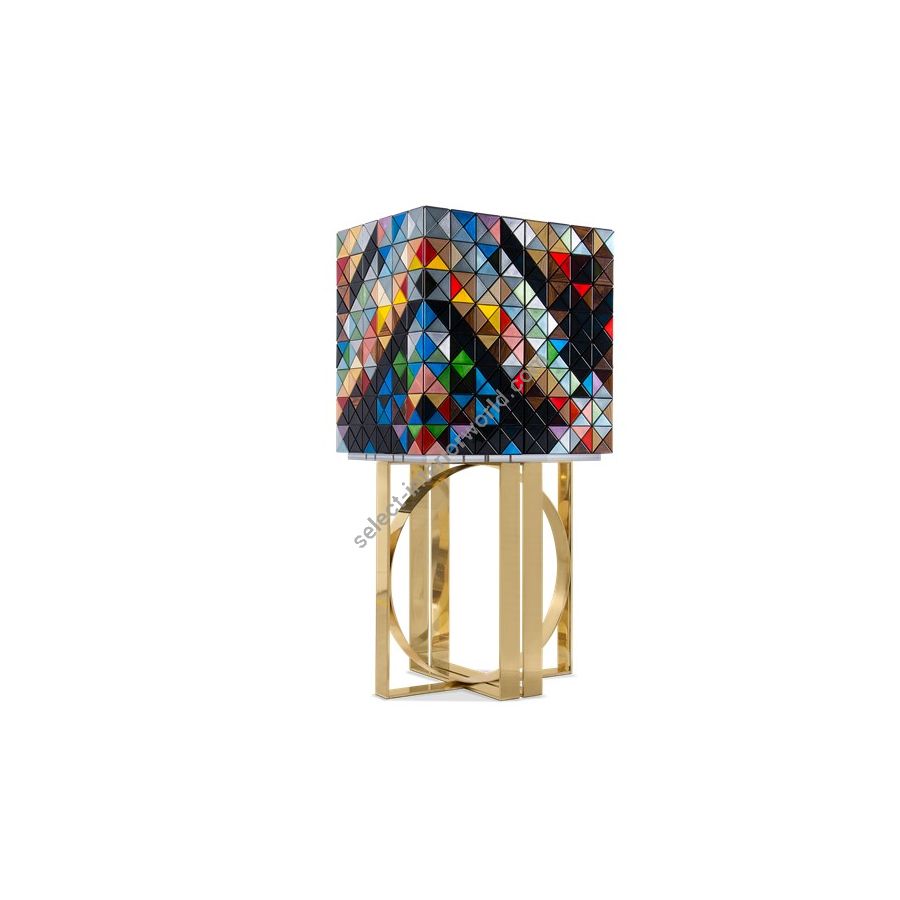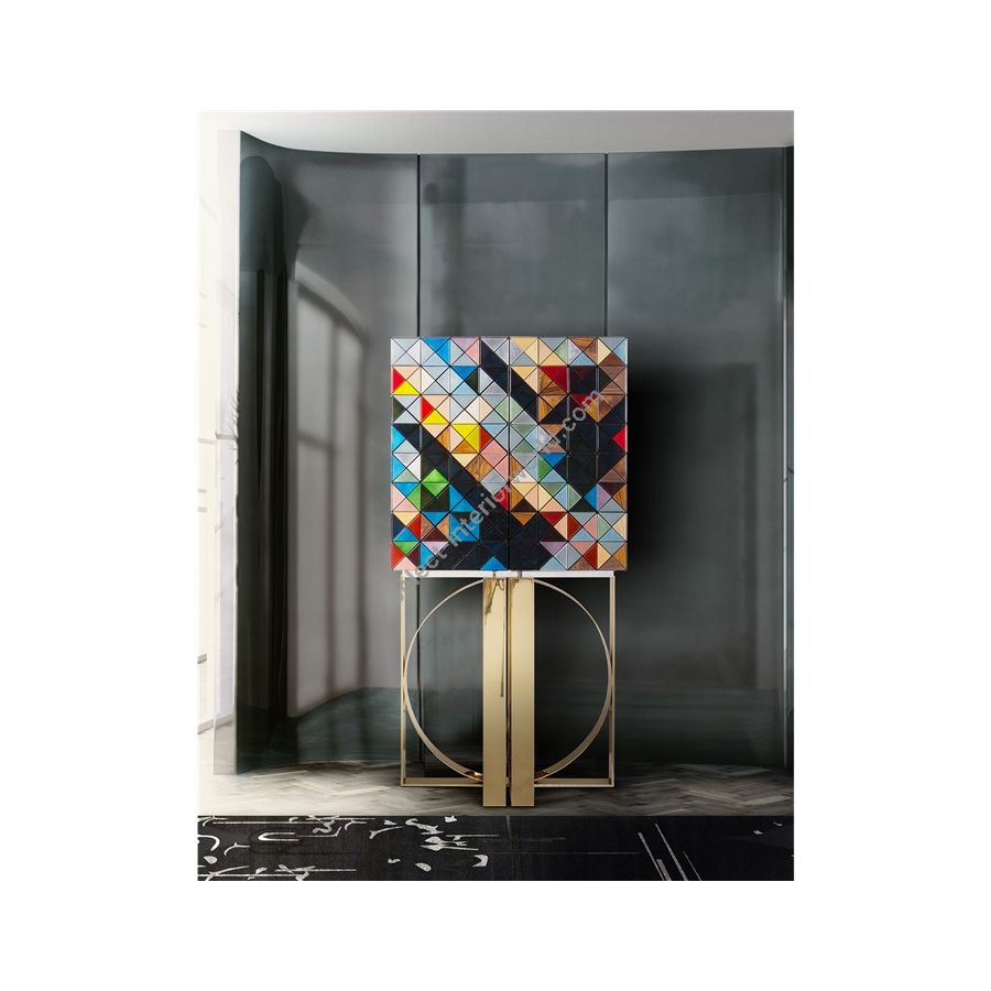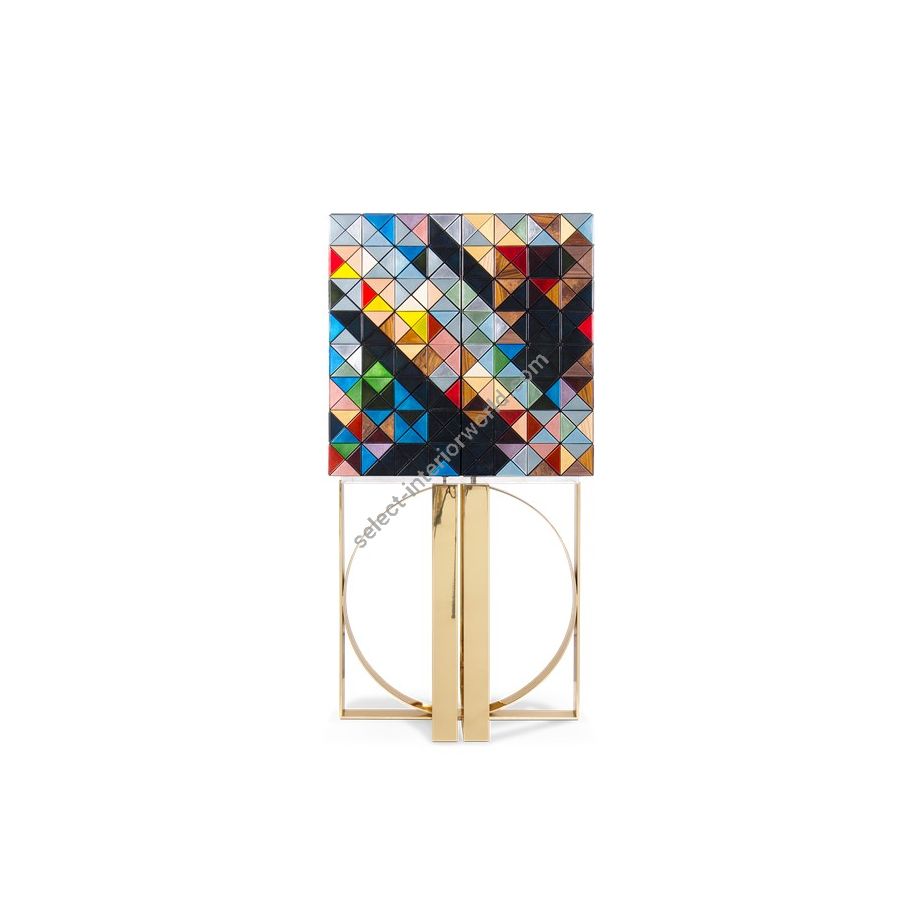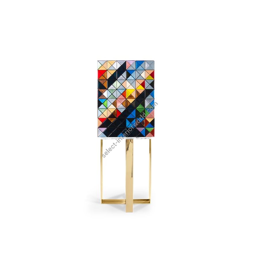 Iconic and unparalleled, the Pixel Cabinet presents a ground-breaking work of pioneering design. This piece carries the dedication and art of those who built it, a variety of traditional production techniques to craft an avant-garde furniture piece that is authentic, joyful and a perfect match for the digital age. Its playful character is captured in shape and color palette, challenging design and finest craftsmanship. Made out of 1088 triangles, the upper part of the Pixel Cabinet plays with perception and combines exceptional materials with multicolored compositions to give the cabinet a unique, striking design: handmade leaf gilding triangles, 10 different types of wood leafs from palisander to African walnut veneer, and lacquering. Behind its two doors, this bar cabinet surprises with a timeless combination of aged mirror and a diamond quilted blue silk fabric, containing nine interior drawers, each one with its own golden knob. The polished brass base gives Pixel a unique and sophisticated character.