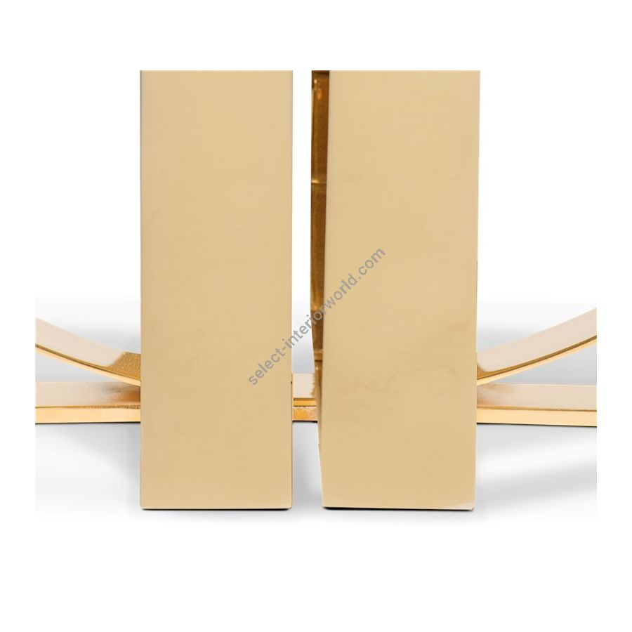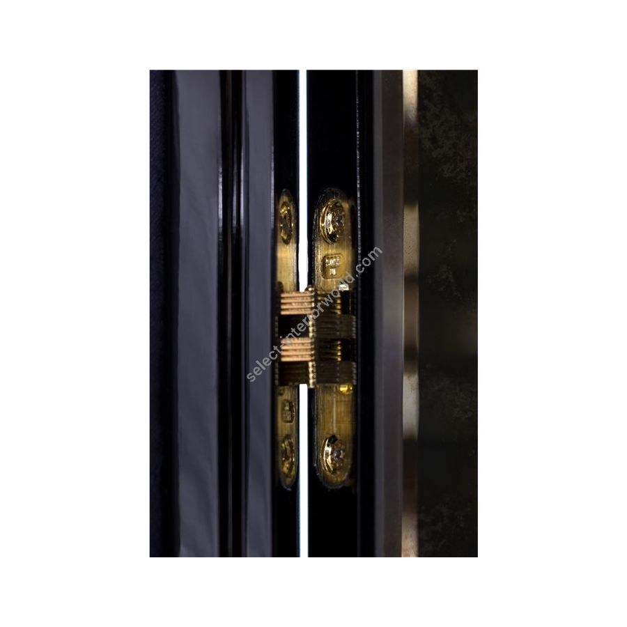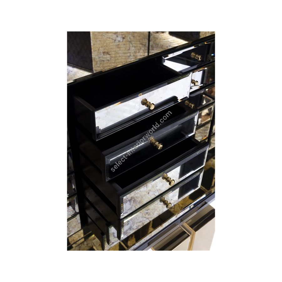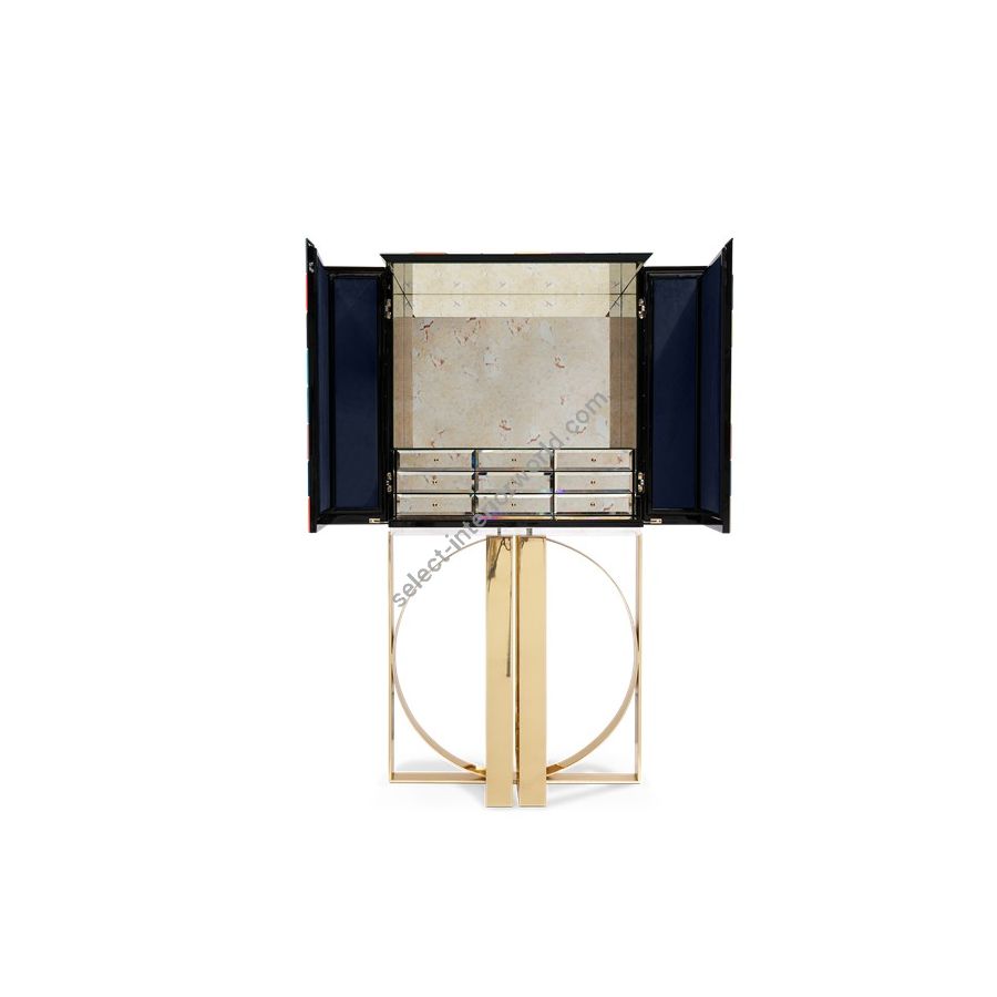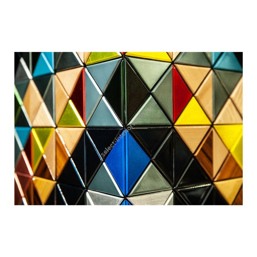 Iconic and unparalleled, the Pixel Cabinet presents a ground-breaking work of pioneering design. This piece carries the dedication and art of those who built it, a variety of traditional production techniques to craft an avant-garde furniture piece that is authentic, joyful and a perfect match for the digital age. Its playful character is captured in shape and color palette, challenging design and finest craftsmanship. Made out of 1088 triangles, the upper part of the Pixel Cabinet plays with perception and combines exceptional materials with multicolored compositions to give the cabinet a unique, striking design: handmade leaf gilding triangles, 10 different types of wood leafs from palisander to African walnut veneer, and lacquering. Behind its two doors, this bar cabinet surprises with a timeless combination of aged mirror and a diamond quilted blue silk fabric, containing nine interior drawers, each one with its own golden knob. The polished brass base gives Pixel a unique and sophisticated character.