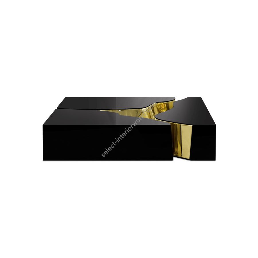 Lapiaz center table takes exceptional craftsmanship and design to a new realm. A functional artwork conceived in three modules for unexpected combinations. Its organic features are achieved through the manual fitting of the polished brass sheet, and a sharp exterior finished in glossy black lacquer. The hammered brass details convey both dynamics and elegance to bring a new contemporary verve into refined interiors. Finding beauty in the most unexpected places, this contemporary coffee table is inspired by authentic karst formations created by surface dissolution, freezing, or thawing of dolomite rocks. Born from cold and freshly cracked to showing off the world rich, golden interior.