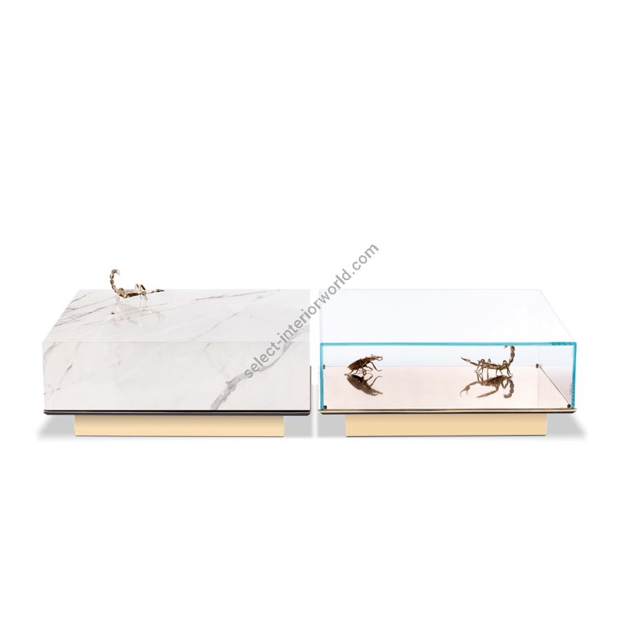 A set of two tables. One module is composed of a glass box which envelopes 3 gold plated elements of 2x scorpion and 1x pollock beatle, laying in a base of gold plated brass. The second module is composed of marble box over wood structure, gold plated base.