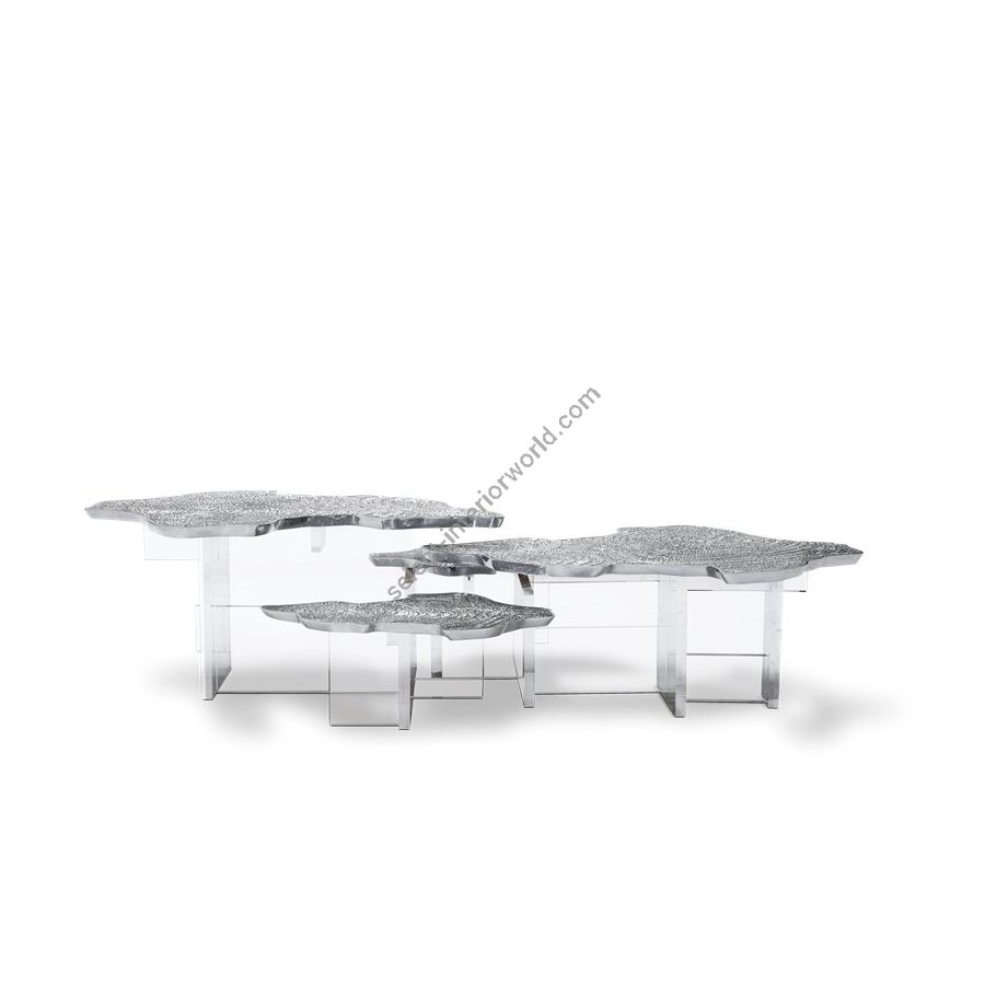 Depicting nature in an innovative way, the Water Lillies series are gently brought to life in an elegant coffee table with gold surface made from cast brass with a unique textured finish. Featuring both contrasting shapes and materials, as the unconventional compositions of the artist, the contemporary coffee table is supported by a geometric acrylic base, allowing to capture natural light. An immersive exceptional objet, the Monet center table is perfect for cutting-edge living rooms.