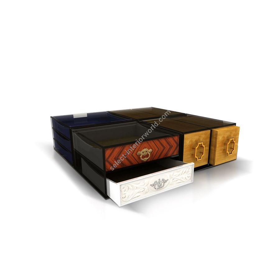 This coffee table, composed by 9 drawers, works in a modular system that offers you the possibility to change the drawers’ position in order that you can create your favorite composition whenever you feel like. All the drawers are customized as we also offer you the possibility to change the materials and the finishing.