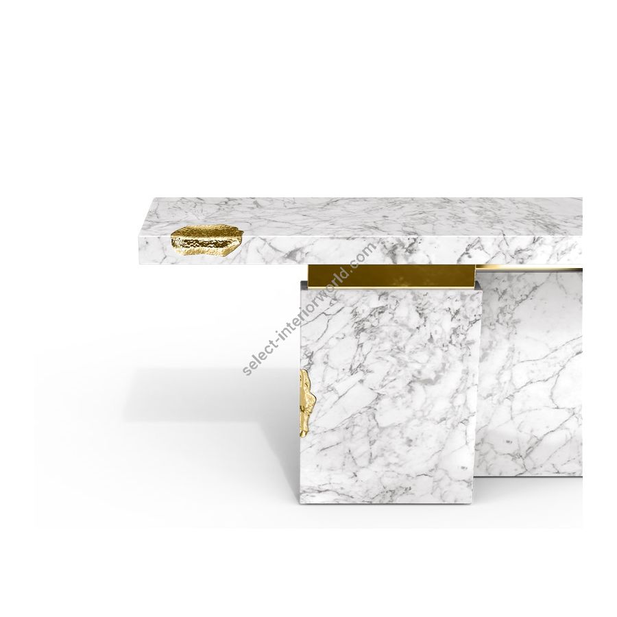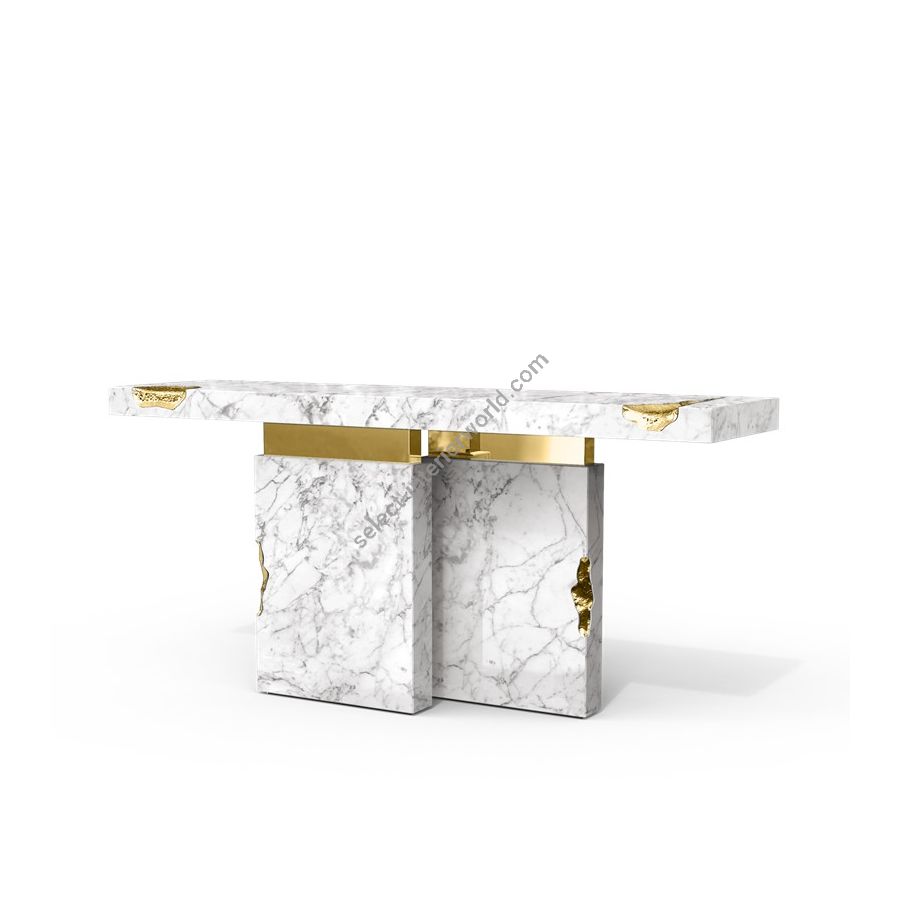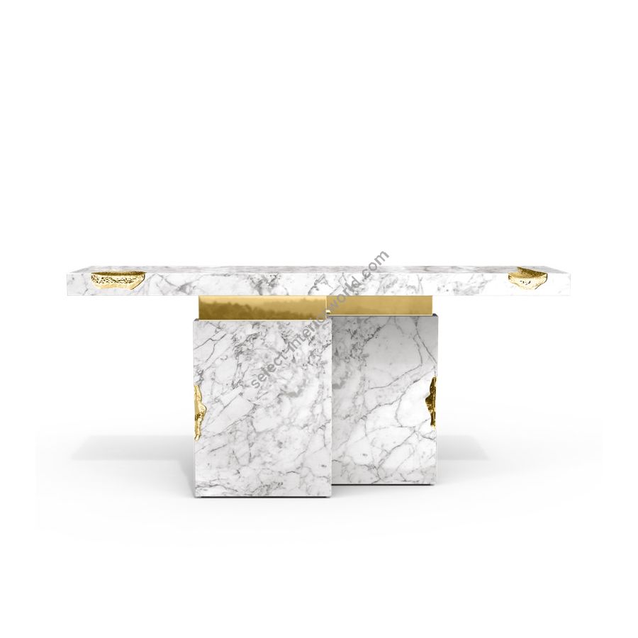 The Empire is a sublime console built in marble with polished brass details. Its cracks are hand-carved and inserted through polished brass sheets, which are hand-hammered for a unique finish. Designed to make an impression, this unique console is a unique masterpiece that will fit perfectly in exclusive entryways or hallways and empowering spaces. A refined statement piece made for those with refined minds and taste.