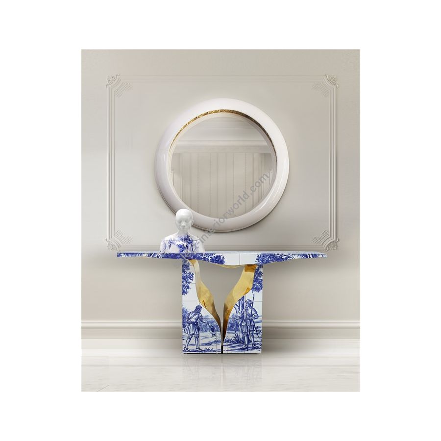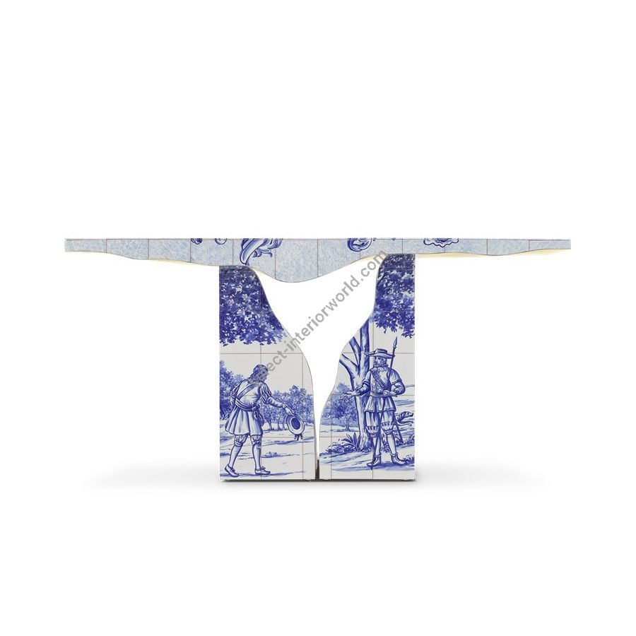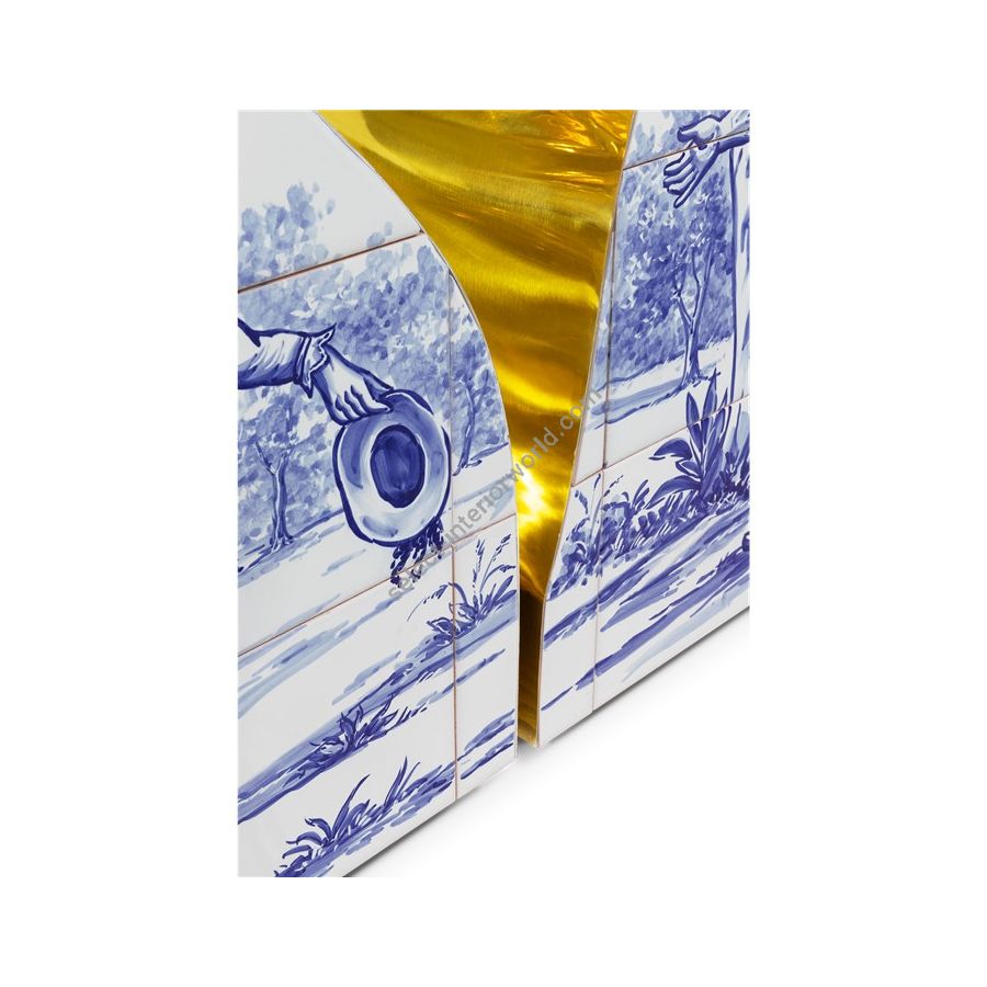 Lapiaz console takes exceptional craftsmanship and design to a new realm. This contemporary console is masterfully covered by white and blue Azulejos, the traditional hand painted tiles, one of the most representative art forms of Portuguese culture. Its organic feature is achieved through the manual fitting of the polished brass sheet, freshly cracked to show a rich golden interior. Finding beauty in the most unexpected places, this elegant console is inspired by authentic karst formations, a true masterpiece to bring a new contemporary verve into interior design.