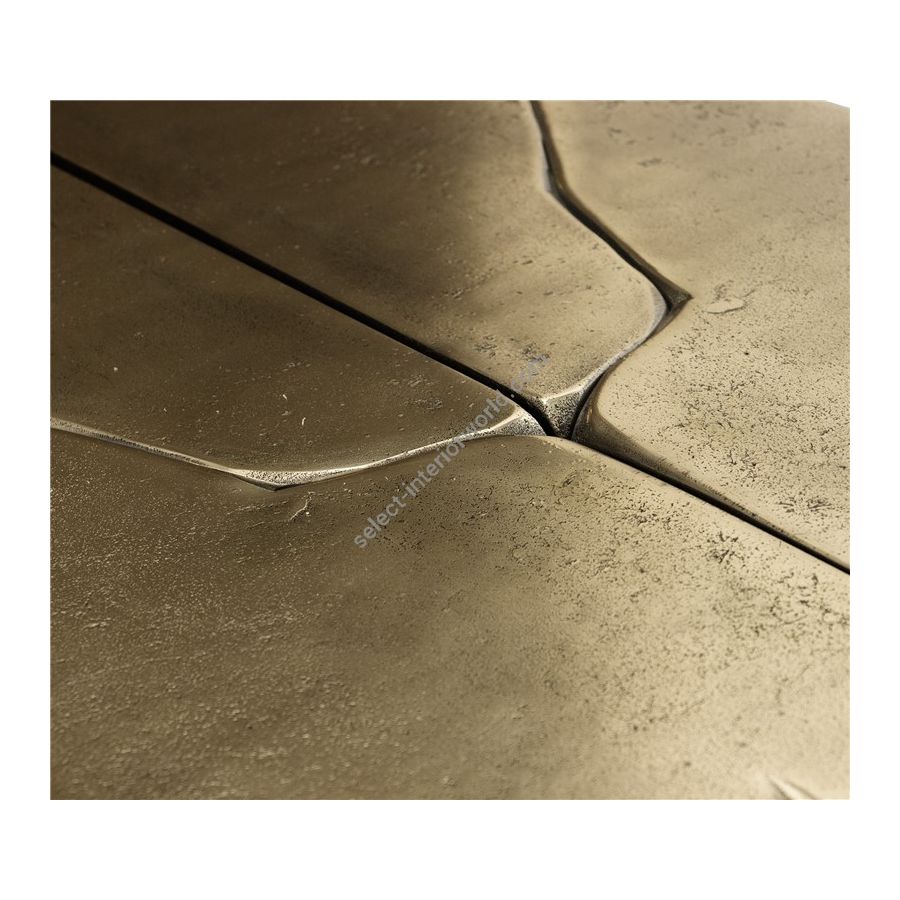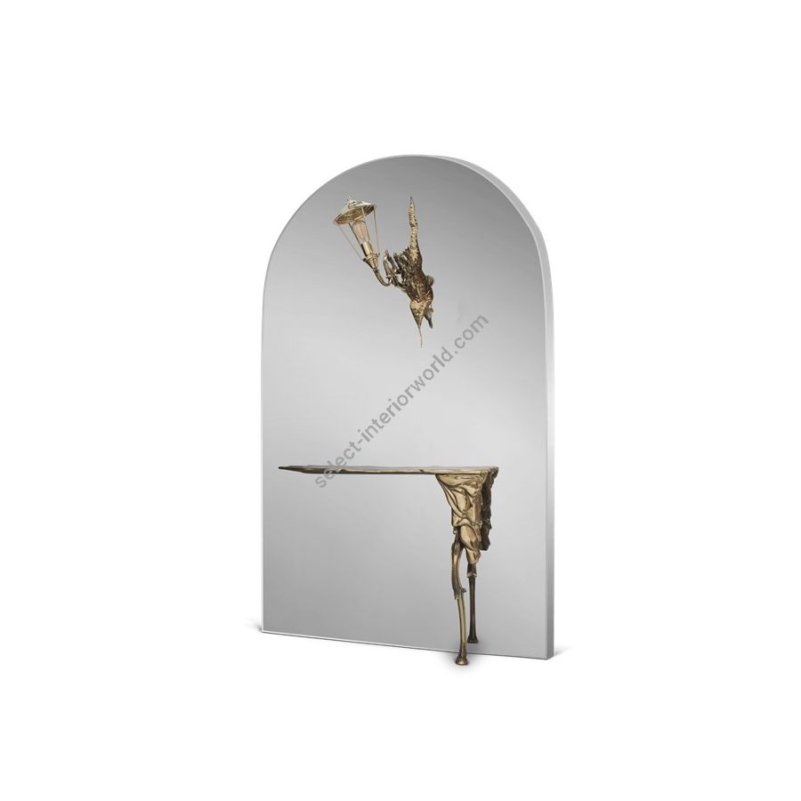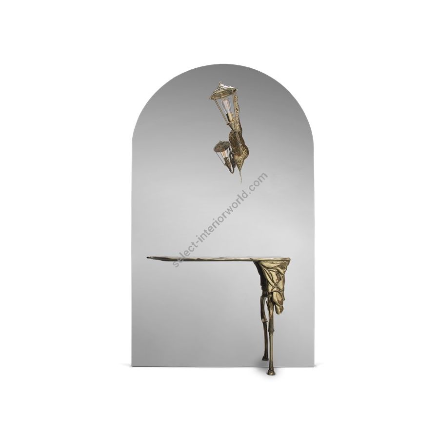 The mystic of the late XIX century boulevards is brought to your home by the masterpiece that is Lumière Console. A synergy of Victorian street lights and architectural lines, the Lumiere exemplifies the contemporary dualities of art and functionality. A sculptural set composed by a large wall mirror, golden lamp and a functional console lies in one arched frame made of wood folded by polished stainless steel. Through the manual fitting of gold hammered brass sheet bursts an antique fixture with an intricate edge detailing arm, topped by an elegant pane lantern hand-sculpted by casting mold. In the lower section, a unique console made of cast brass arises to add to this artwork piece an extra functionality. Born from the rich tradition of iron forging and skilled goldsmiths, this majestic mirror lamp console installation is a soulful piece with classic tones for outstanding private residences or great contract settings. A ground-breaking collectible design for present day luxe and timeless statement.