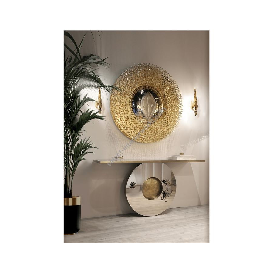 The Metamorphosis Console is composed by a top and base finished in polished inox and brass beautified by the presence of golden creatures. Two brass plated feet with casted brass details.