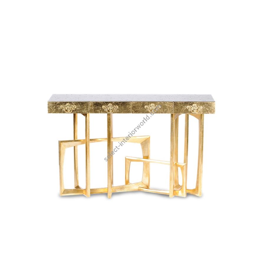 Metropolis console raises the level and expands the limits of design with a base of elegant composition and gracious lines. This exquisite table was designed to add a note of distinctive charm to a living room or a wide hall. Its base is handcrafted from mahogany and the top is framed in particleboard, which gives the black high gloss lacquer its texture appearance. There are four drawers with delicate brass handles. Metropolis is a modern console table available in either black or gold.