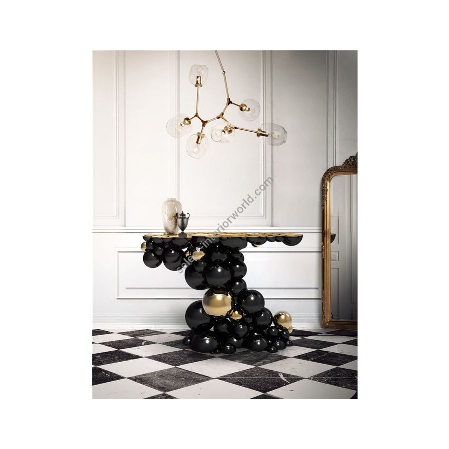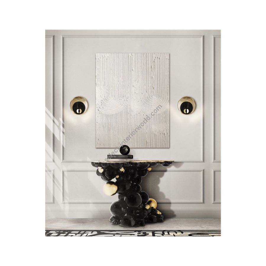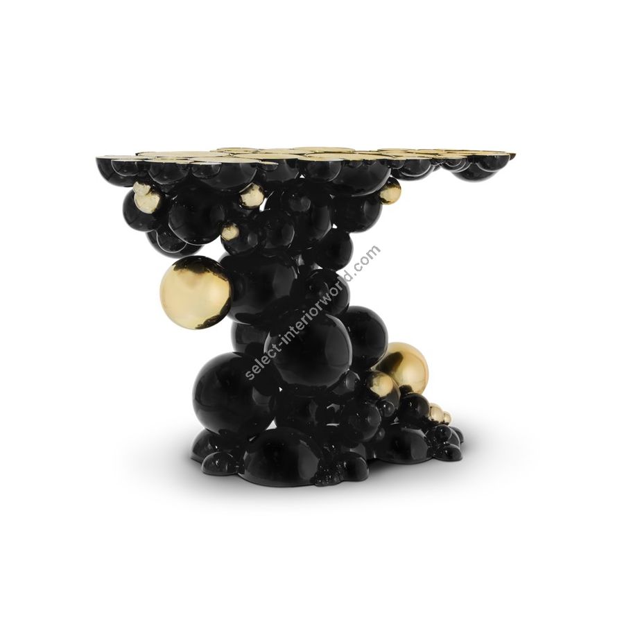 Defying the laws of physics, the Newton black and gold console has grown from the ancient art of casting metal, where metal is heated until molten into spheres and semi-spheres shape. One by one, each element is joint to produce an outstanding pattern and organic structure, finished in a dramatic black lacquer and gold plated accents. The top of this console table is composed of brass circles carved with a golden texture similar to organic wood texture. A contemporary console that carries cultural legacy while successfully moves towards the future, remaining ahead of the of the design scene. A real expression of exclusivity and high collectible craftsmanship outcome.