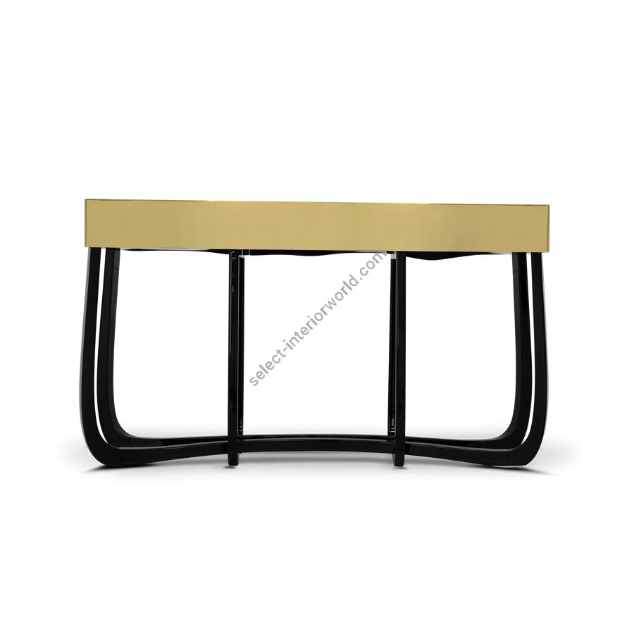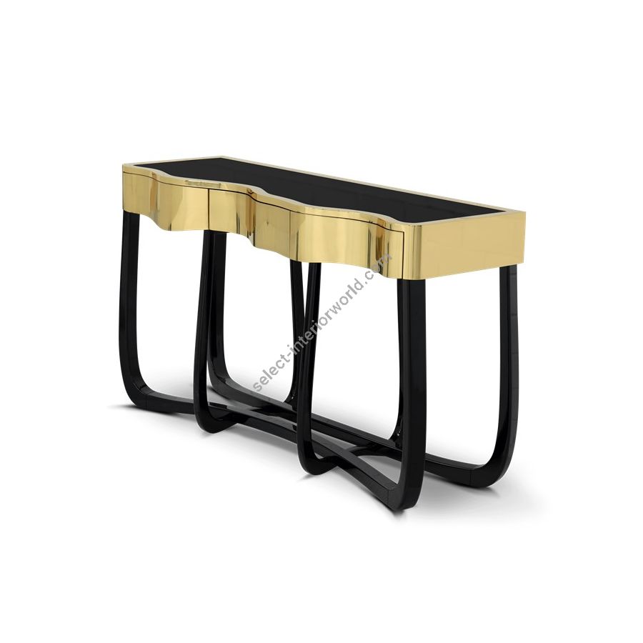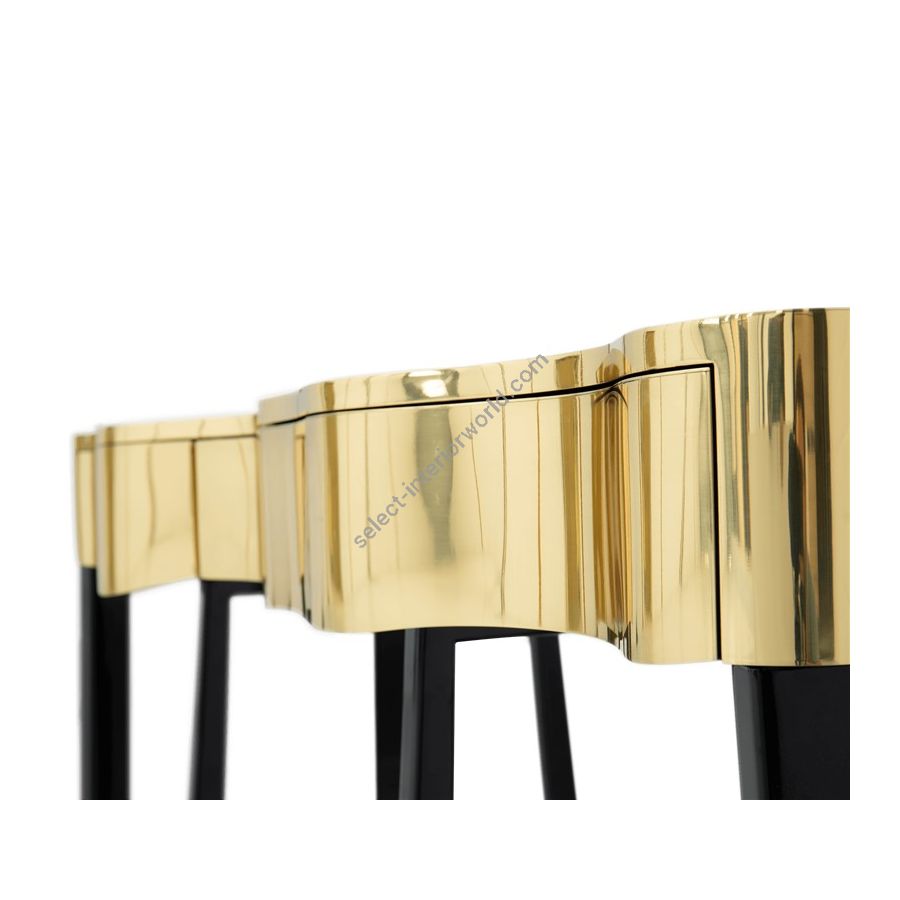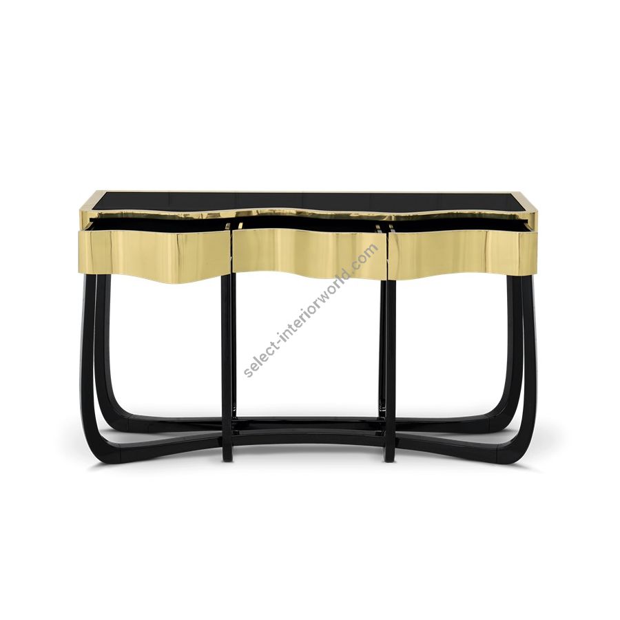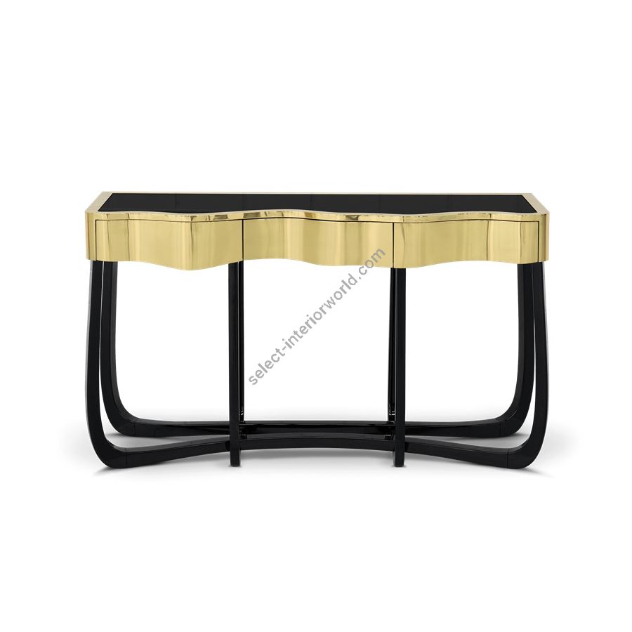 Boca do Lobo is an exclusive design furniture company that transcends the fusion of traditional and contemporary design. With Sinuous Patina Console you will successfully create a luxurious environment. Sinuous lines draw the elegant character of this console, gathering the styling of the best sellers of Coolors Collection. Sinuous is made for those who love harmonious lines mixed with exquisite detail. Its design is seductive and lures you into a magical and golden world. To achieve extravagance, Boca do Lobo’s artisans handcrafted the structure in mahogany with a high gloss black lacquer finish and top coated in polished brass plated, bringing up the vivid and bright side of Boca do Lobo. Contains three drawers.