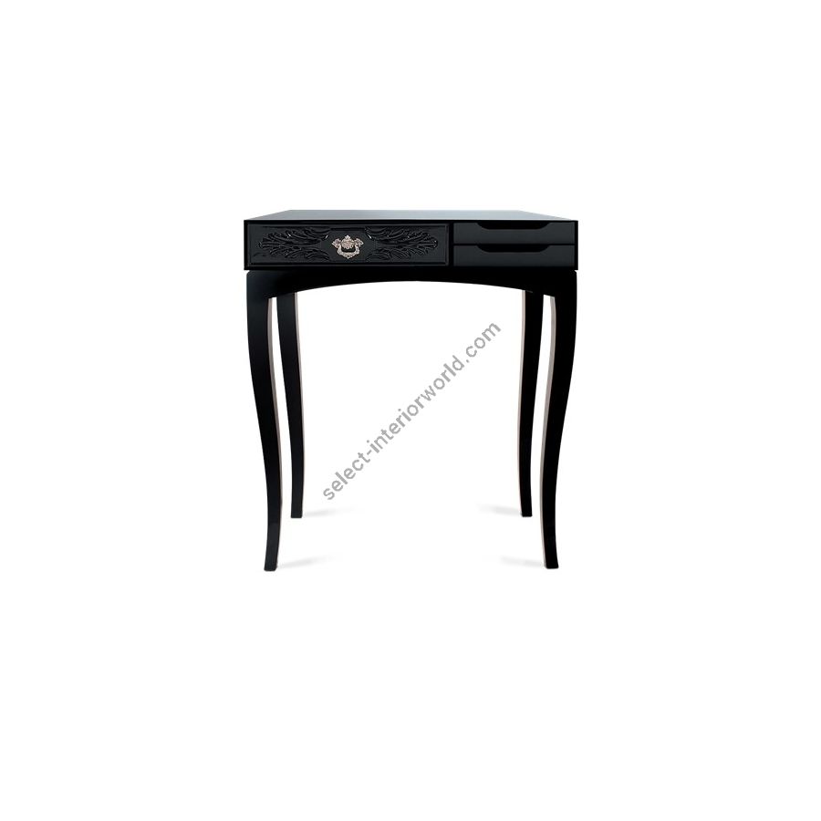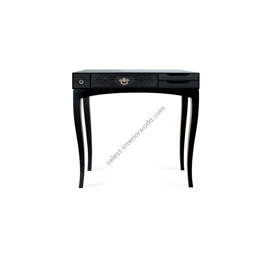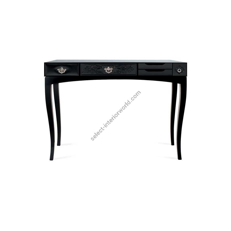 This console bases is made from wood and tempered glass and 5 drawers compose it. Its base is made in lacquered wood. It contains drawers with: handcrafted fronts lacquered in white; fronts made in maquetry and brass handles; fronts with golden leaf and fronts lacquered in blue.