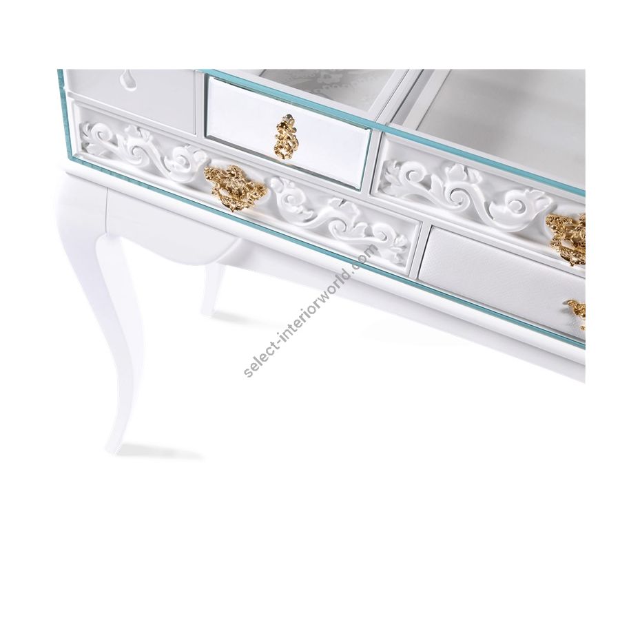 The base is composed by mahogany. The box is made by tempered glass with a frontal opening for the drawers. The structure is made in wood lacquered in white with a matt varnish; the drawers are handcrafted and contain wadding and a grey mirror. Handles are made through foundry process.
