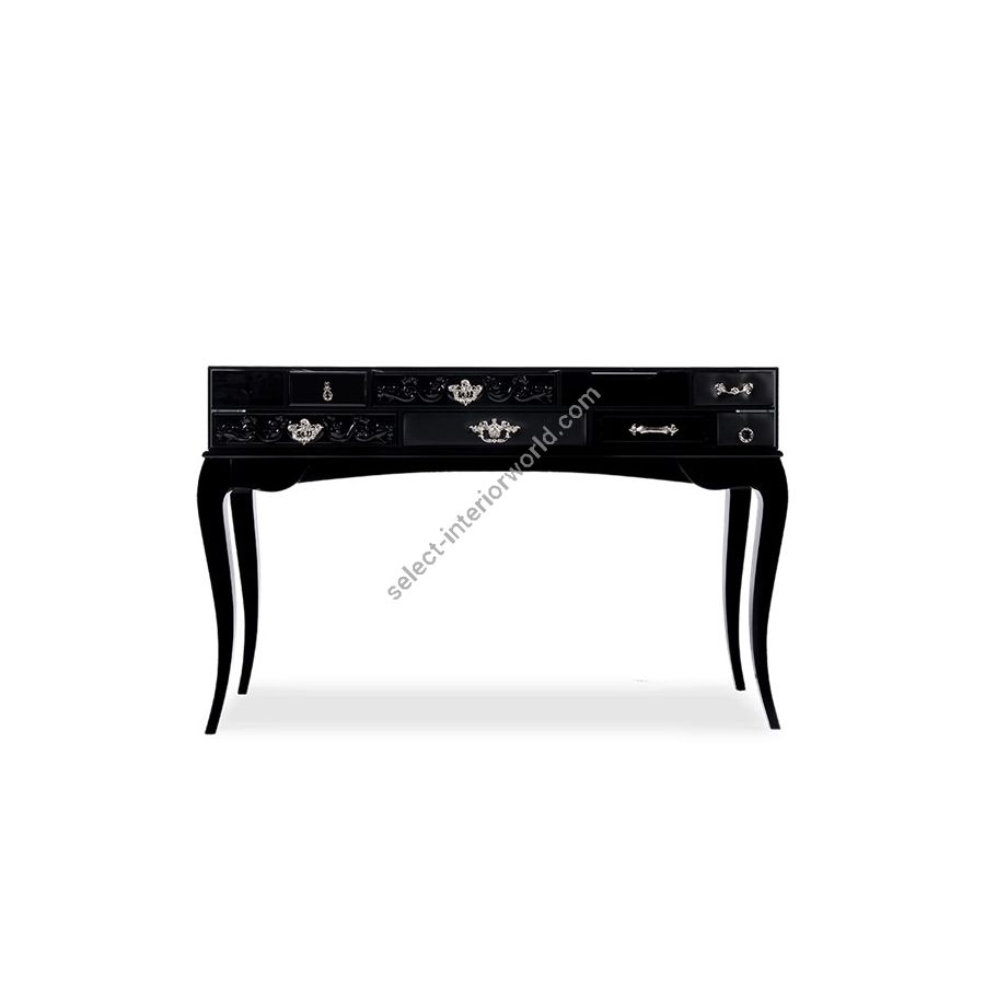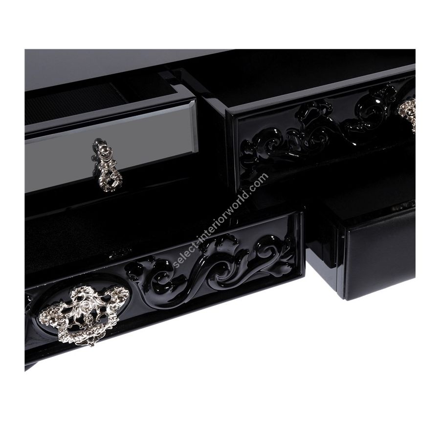 Mahogany Wood lacquered in black with a high gloss varnish, Grey Glass, Silver Plated Brass, Grey Mirror in Bevelling, Drawers: High gloss black lacquer and leather, glass lacquered in black, lacquered woodwork.