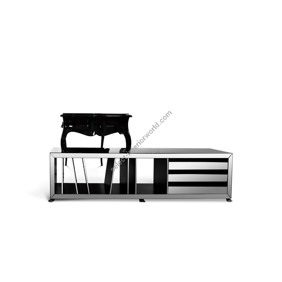 The Boulevard modern desk is a highly desirable classical piece. Perfect for your home office, or for a private space in your modern house, where you wish to register your thoughts and your ideas. Crafted from solid wood, this writing desk features a black leather top and three drawers with a classic cast brass handle finished in black. The attached drawer file unit has ample storage and is covered in a smoked mirror.