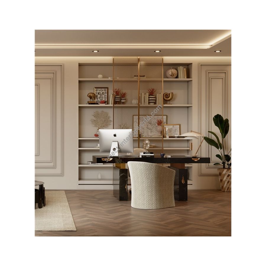 An elegant writing desk built in marble with polished brass details. Its cracks are hand-carved and inserted through polished brass sheets, which are hand-hammered for a unique finish.