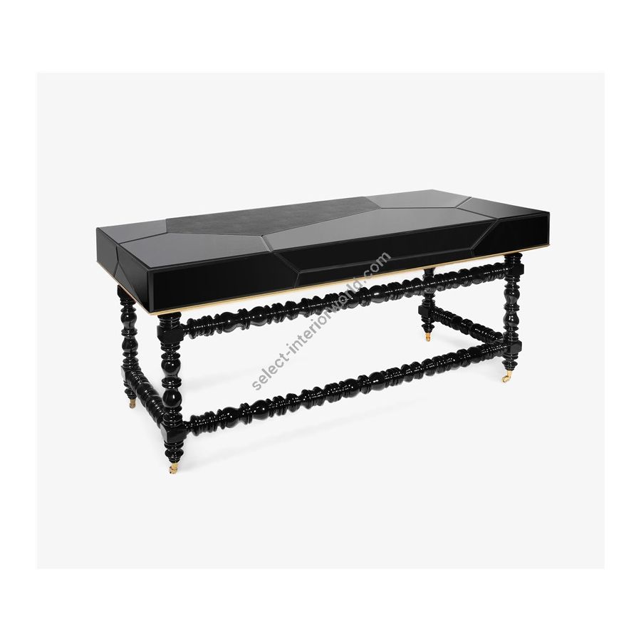 The exquisite Coolors Collection by Boca do Lobo blends sophistication and modern refinement into elegant decorative furniture designs like the Manu writing desk. A furniture piece inspired by the traditional Portuguese secretary of the 16th. Influenced by Manueline style, this black desk is ideal for a classic office or a romantic bedroom. The top is lined with a black lacquered mirror, and the work area is made of leather. The base is turned and lacquered finished with a high gloss varnish. The modern desk Contains three drawers and gold leaf detail.