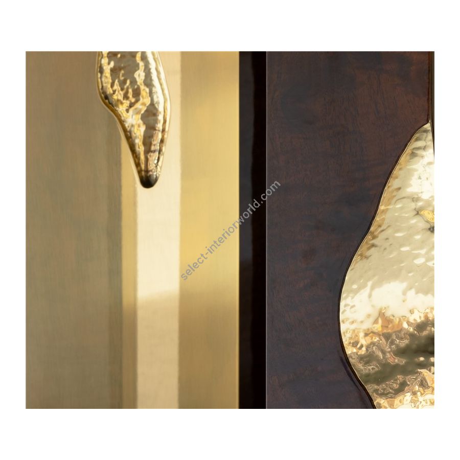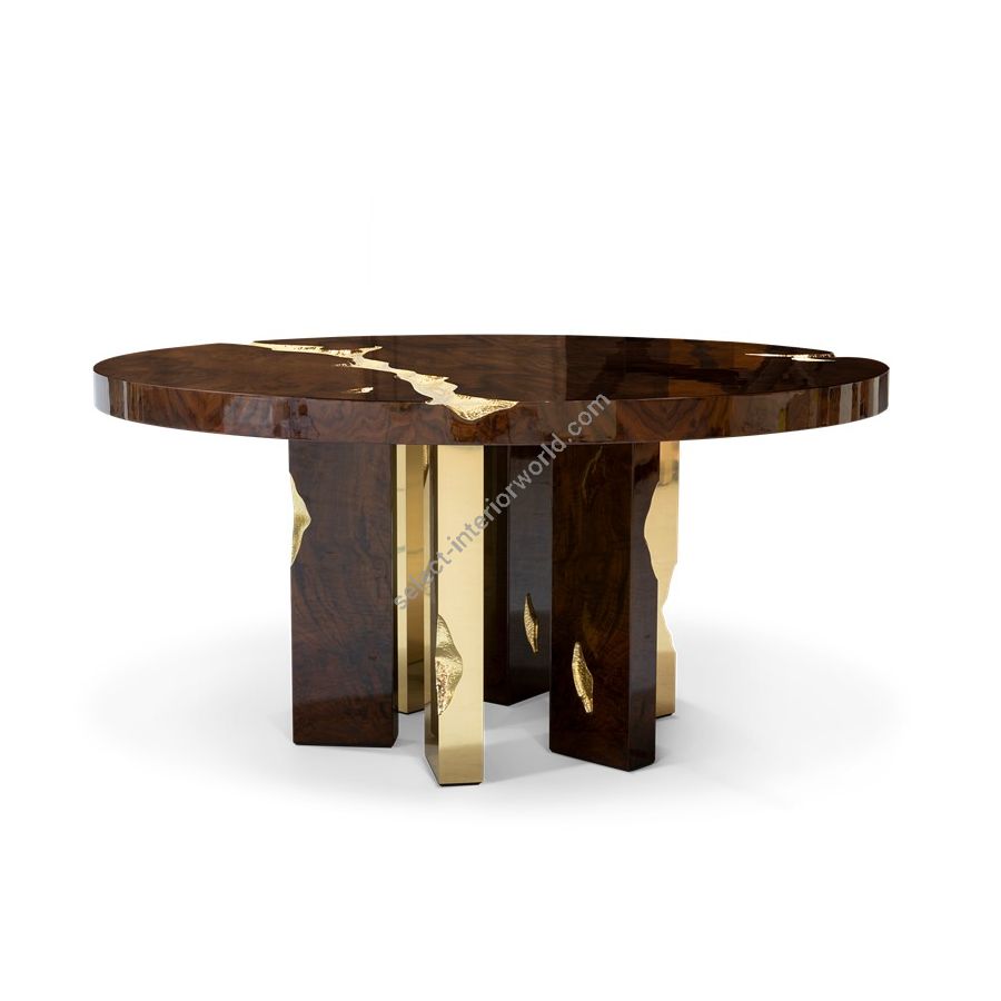 Made in wood and polished brass, this upscale round dining table is an elegant composition of two scaled organic brass tubes. It incorporates richest nature-inspired design, industrious welding techniques and a manually engraved top that emulates the outlines of log rings, reminding the timeline of a tree.