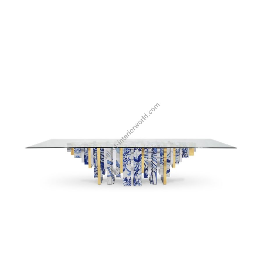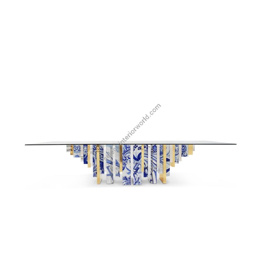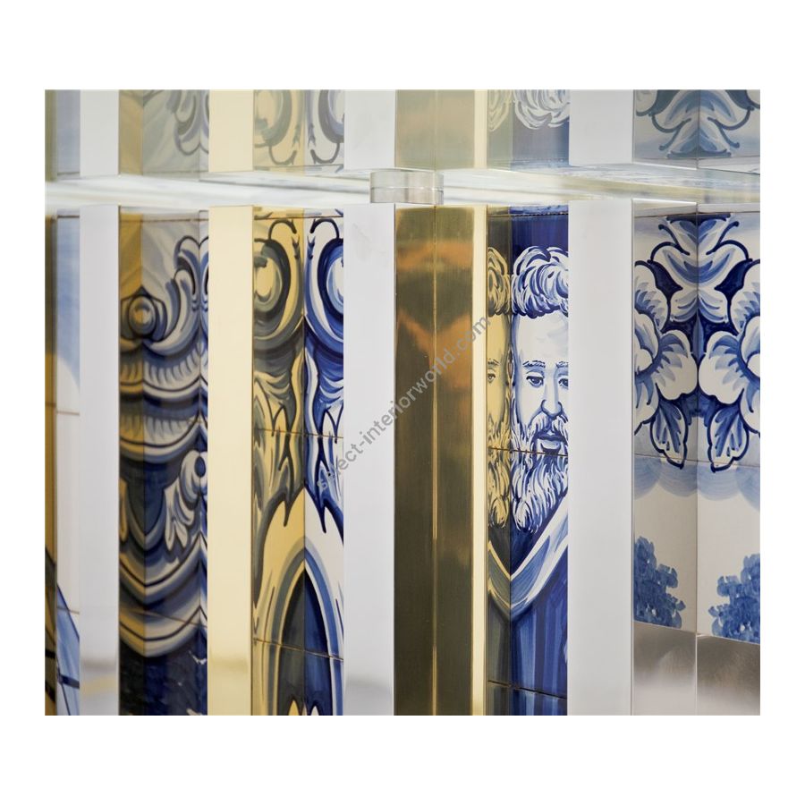 The Heritage Dining Table, much like its sibling Heritage Sideboard and Cabinet, is a highly sophisticated piece inspired by Portuguese history through the use of traditional hand painted azulejo tiles. Its noble design features bold lines, with alternating polished brass, bevelled mirror and azulejo strips and a tempered glass top, which reflect your dining room’s finest elements, yet adding a touch of warmth and finesse.