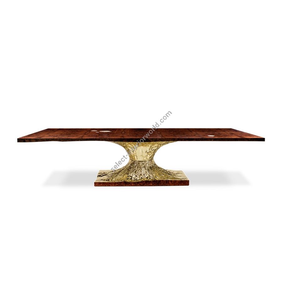 Metamorphosis Dining Table's surface is made in walnut root veneer and includes special textured details that represent a fossil. This piece also embodies high polished brass details to fill the stately base.