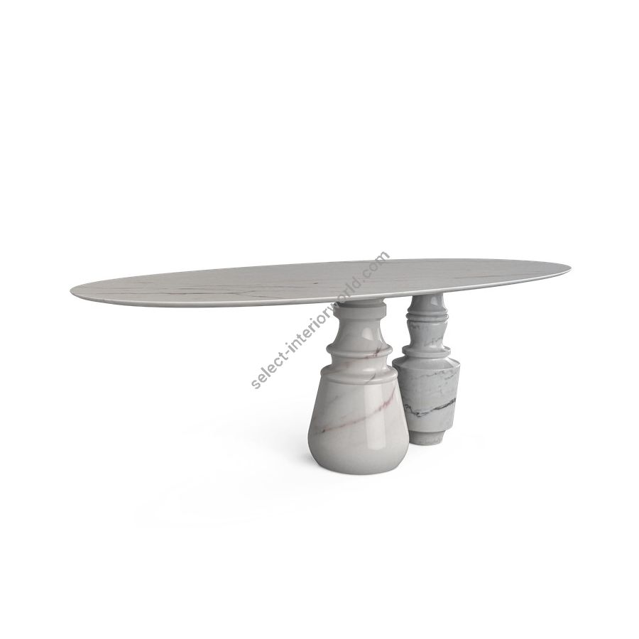 Oval table made of white Estremoz marble. Two detailed pedestal bases in turned marble.
