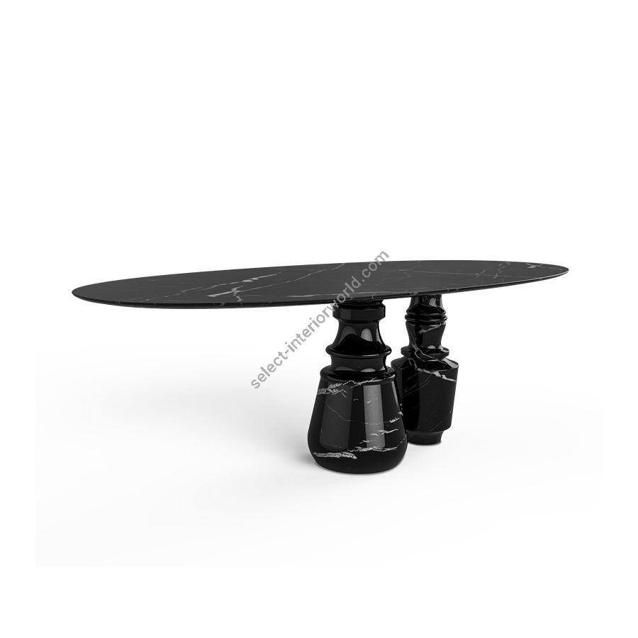 Oval table made of black Nero Marquina marble. Two detailed pedestal bases in turned marble.