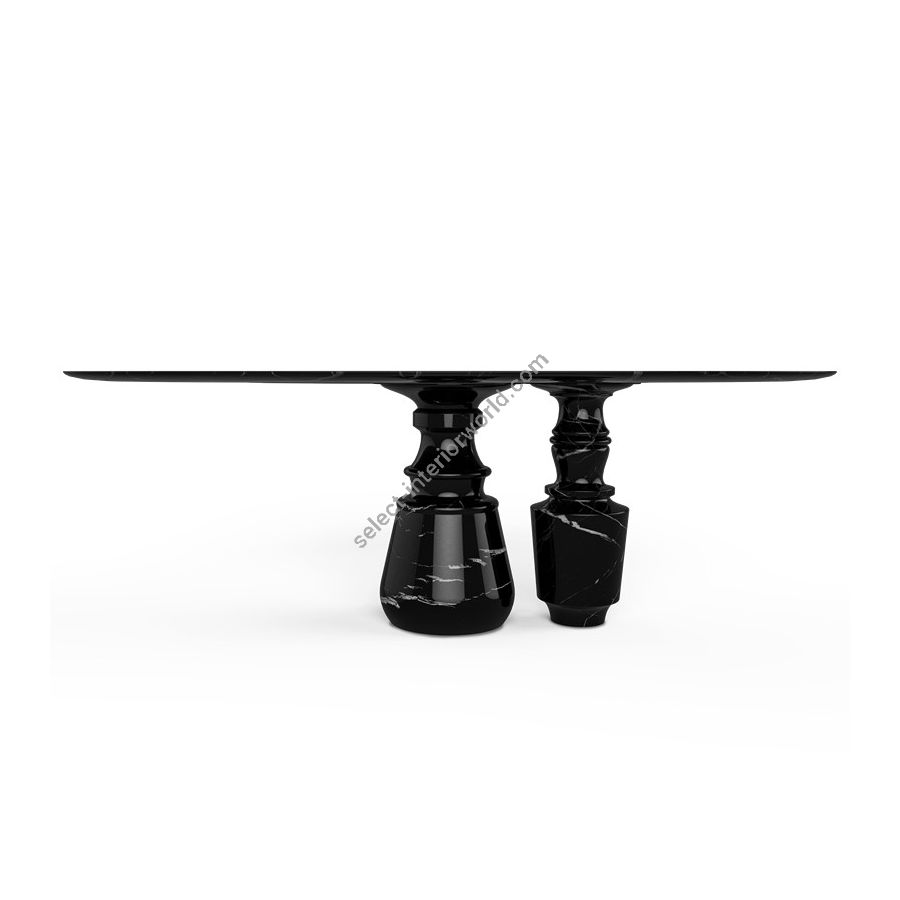Playing with function and sculptural form, Pietra dining table shapes a timeless experience through its classical aura and finest Nero Marquina black marble. Reminding the renaissance era, its oval top gently lies in two robust marble columns, each one conceived from solid blocks hand-sculpted and turned to create different details for additional texture. A noble material carved in Boca do Lobo workshops, conceiving a soulful statement dining table ideal for elegant and refined dining rooms. Designed for eight seats, the contemporary feel of Pietra is effortlessly stylish and it is suitable for indoor or outdoor use.