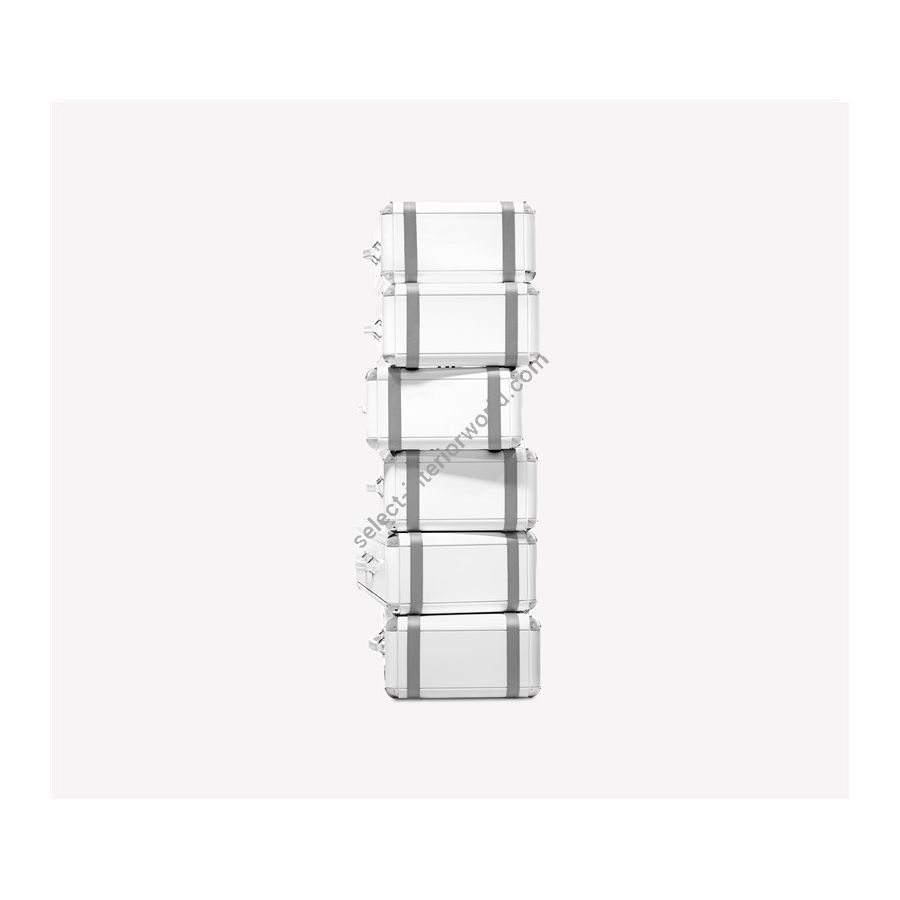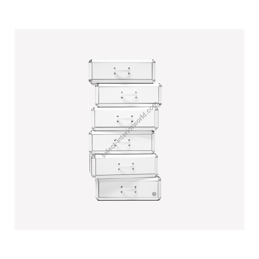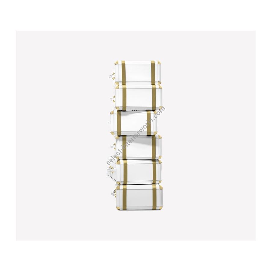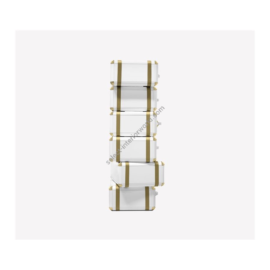 Lacquered in glossy white, Metal parts in gold plated finishing, Strips in gold synthetic leather or Lacquered in glossy white, Metal parts in Nickel Plated finishing, Strips in Grey synthetic leather