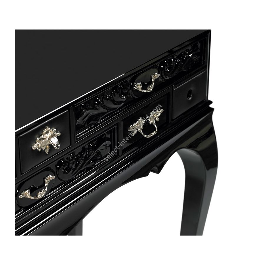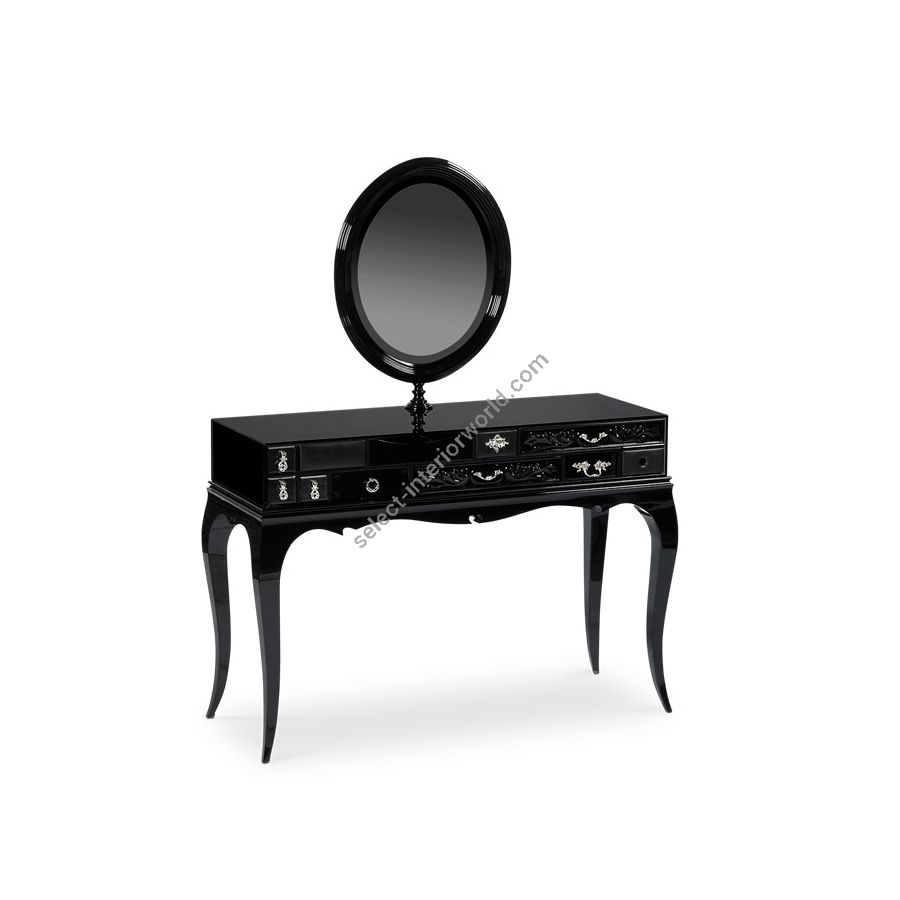 The base is composed by mahogany. The box is made by tempered glass with a frontal opening for the drawers. The structure is made in wood lacquered in black with a high gloss varnish; the drawers are handcrafted and contain wadding and a grey mirror. Handles are made through foundry process. Melrose’s top contains a hole to set an oval mirror that lets you adjust the viewing angle while rotating around a vertical axis, allowing a rotation of 360º.