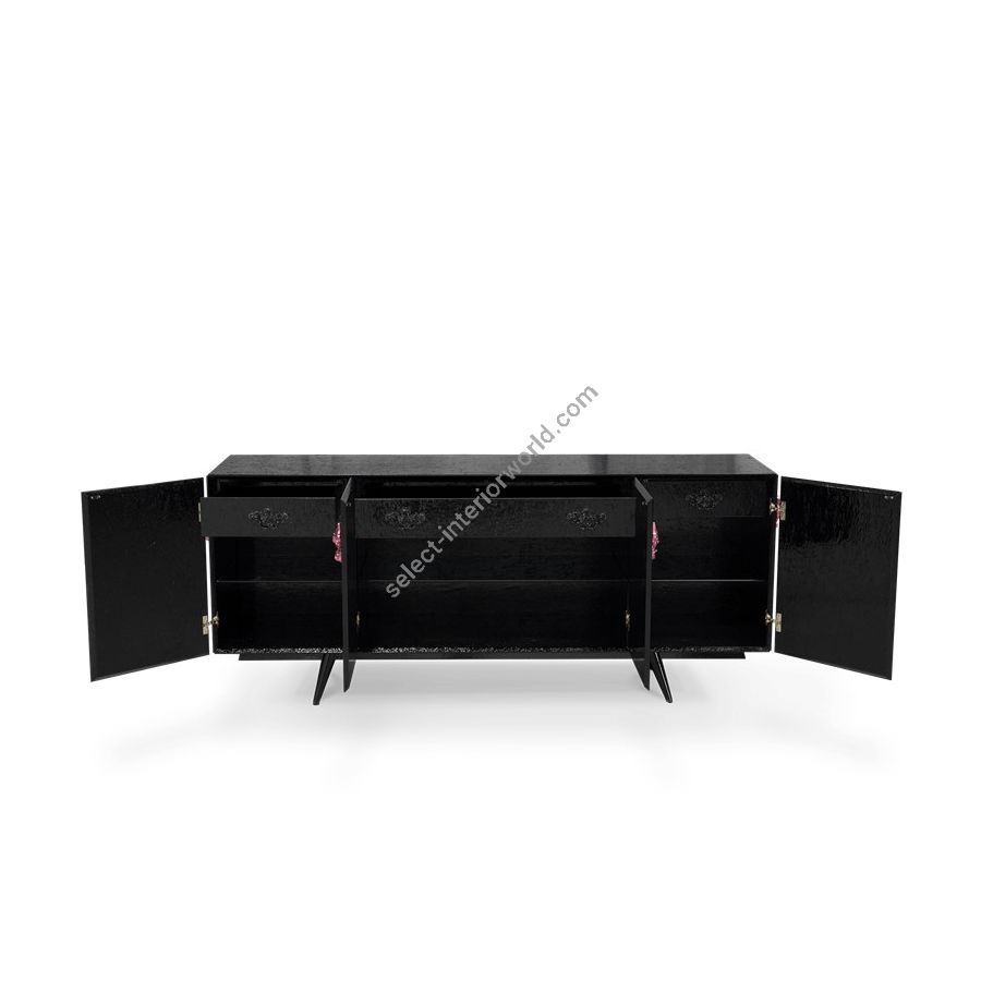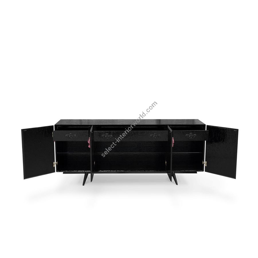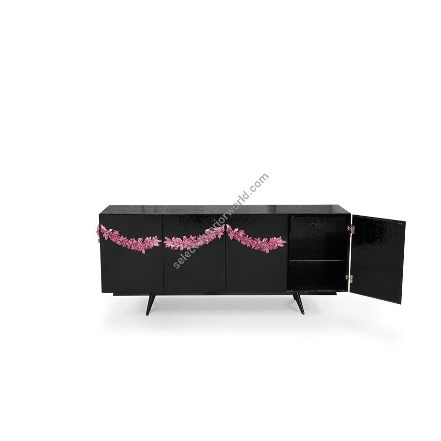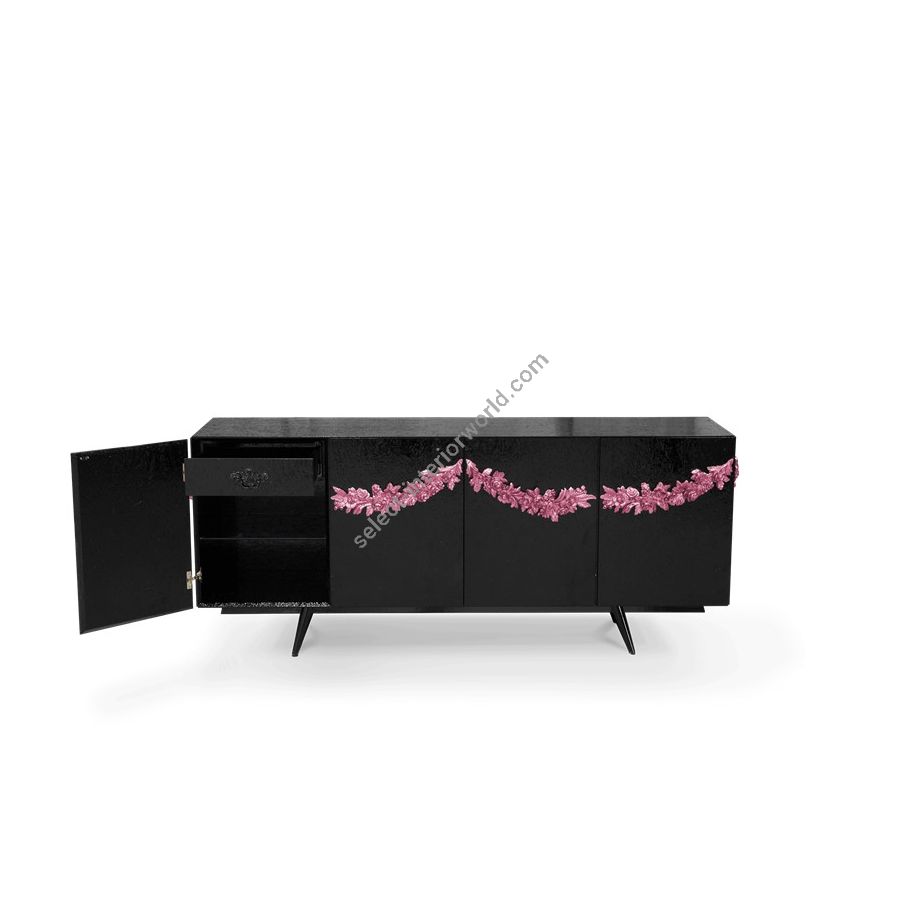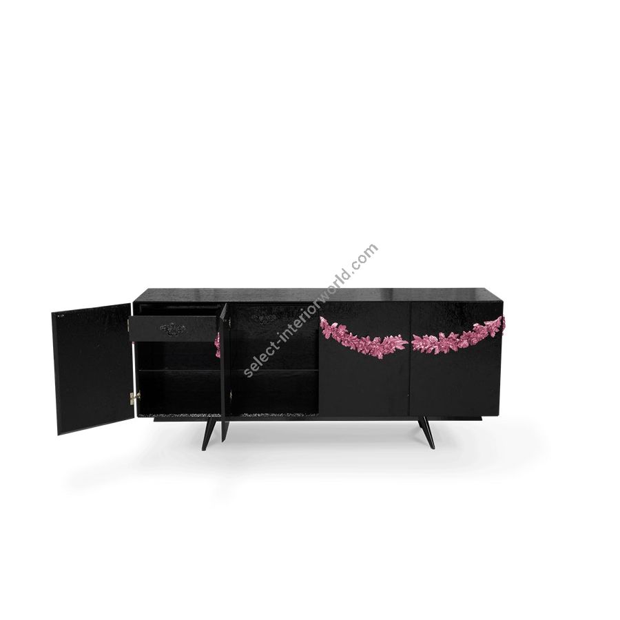 Sideboard handcrafted in wood lacquered in black with a high gloss varnish. With four doors, in its interior you find two drawers and four shelves. In its exterior, the floral garland is made from handcrafted wood finished with a high gloss varnish translucent color over silver leaf in amethyst.