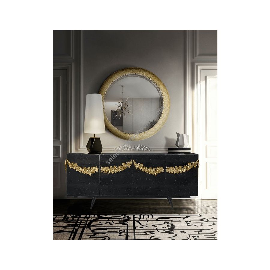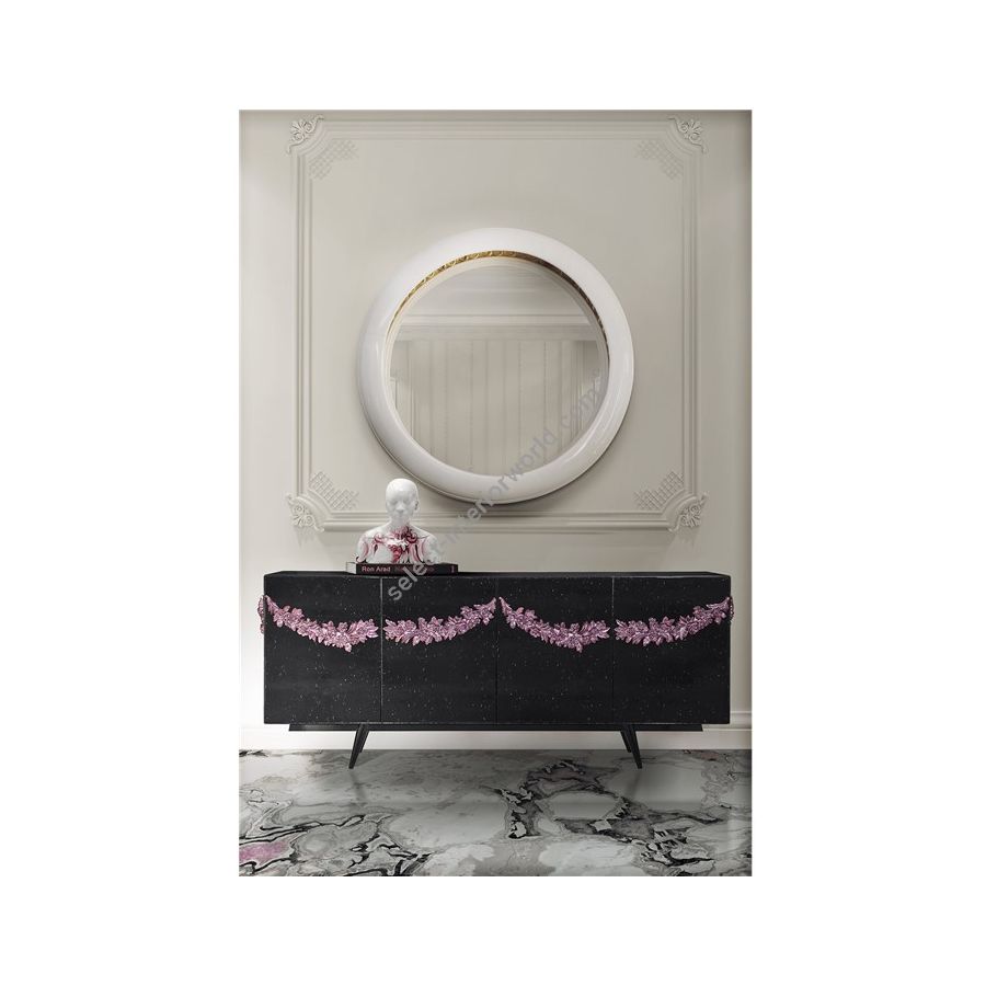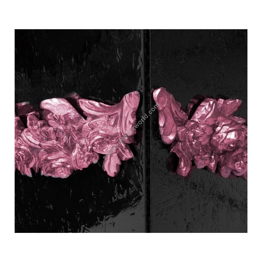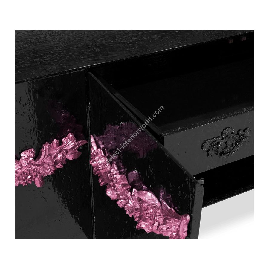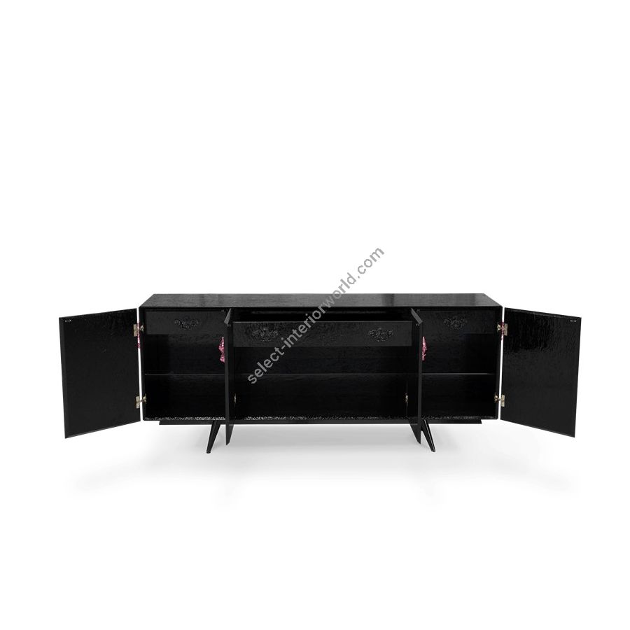 Sideboard handcrafted in wood lacquered in black with a high gloss varnish. With four doors, in its interior you find two drawers and four shelves. In its exterior, the floral garland is made from handcrafted wood finished with a high gloss varnish translucent color over silver leaf in amethyst.
