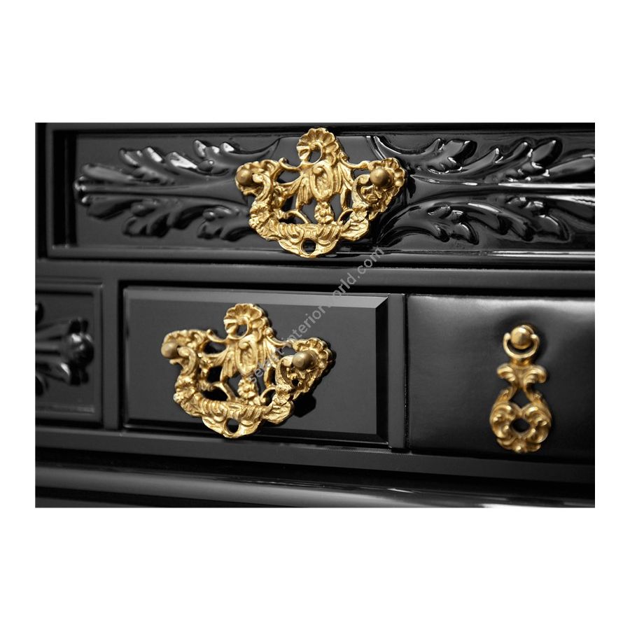 The base is composed by mahogany. The box is made by tempered glass with a frontal opening for the drawers. The structure is made in wood lacquered in black with a high gloss varnish; the drawers are handcrafted and contain wadding and a grey mirror. Handles are made through foundry process.
