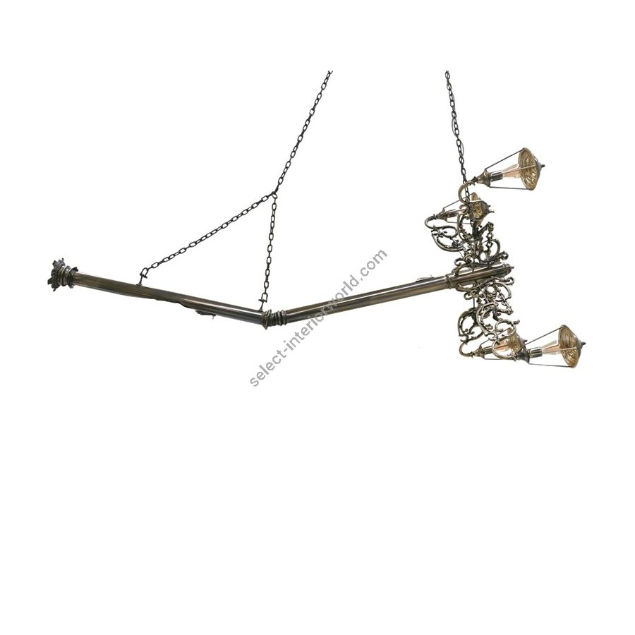 The mystic of late XIX century boulevards are brought home by the masterpiece Lumière suspension lamp. A confluence of Victorian street lights and architectural tectonic form, the Lumiére exemplifies the contemporary dualities of art and functionality. Hanged by two chains, a striking broken pole lies as an antique fixture with four intricate edge detailing arms topped by elegant pane lanterns hand-sculpted by casting molds. Born from the rich tradition of iron forging and skilled goldsmiths, this majestic chandelier is a soulful piece with classic distinction for outstanding private residences to the greatest contract settings. A ground-breaking collectible design for present-day luxe and timeless statement.