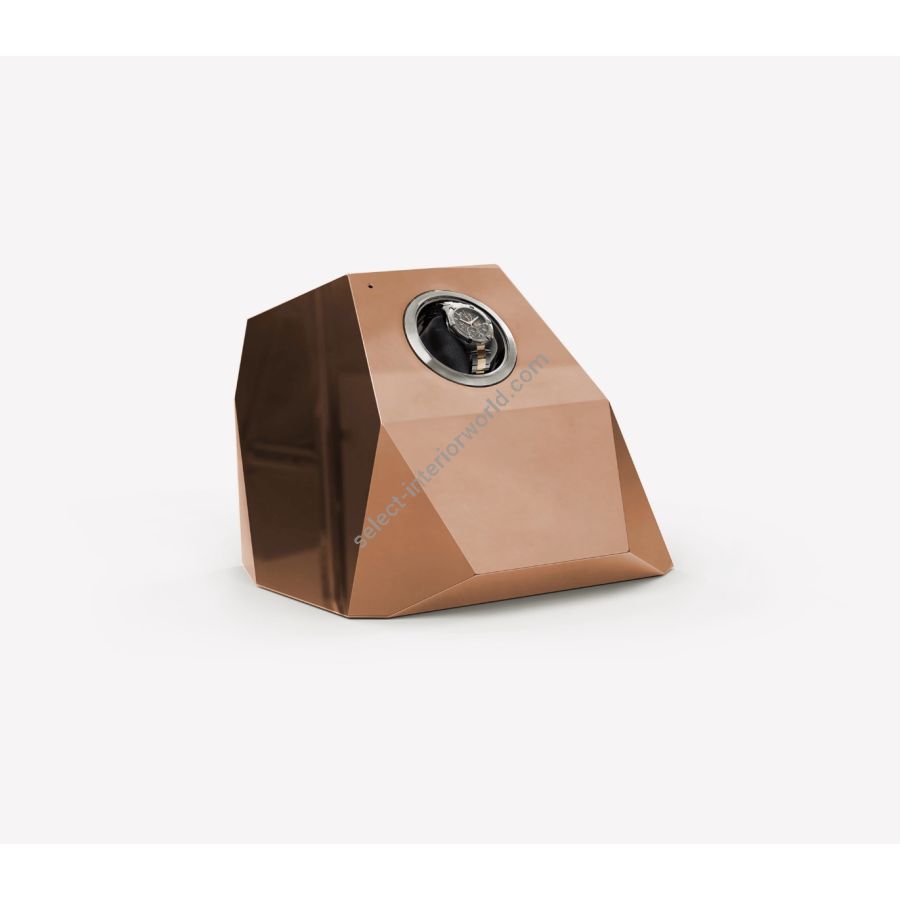 The Diamond design piece reinterprets the quintessential diamond shape throughout contemporary design, a beautiful outcome of architectural thinking with elegant faceted lines. A single module watch winder that provides proper care and secure storage to high-end watches. Lapidated like a precious stone, this beautiful piece is sculpted in mahogany wood, finished in lacquer or gold leaf and high gloss varnish coat, featuring one single rotor that will keep an automatic watch mechanism going long after time takes its toll. A precious object that will turn any timer into a display piece, enhancing any elegant and luxury room.