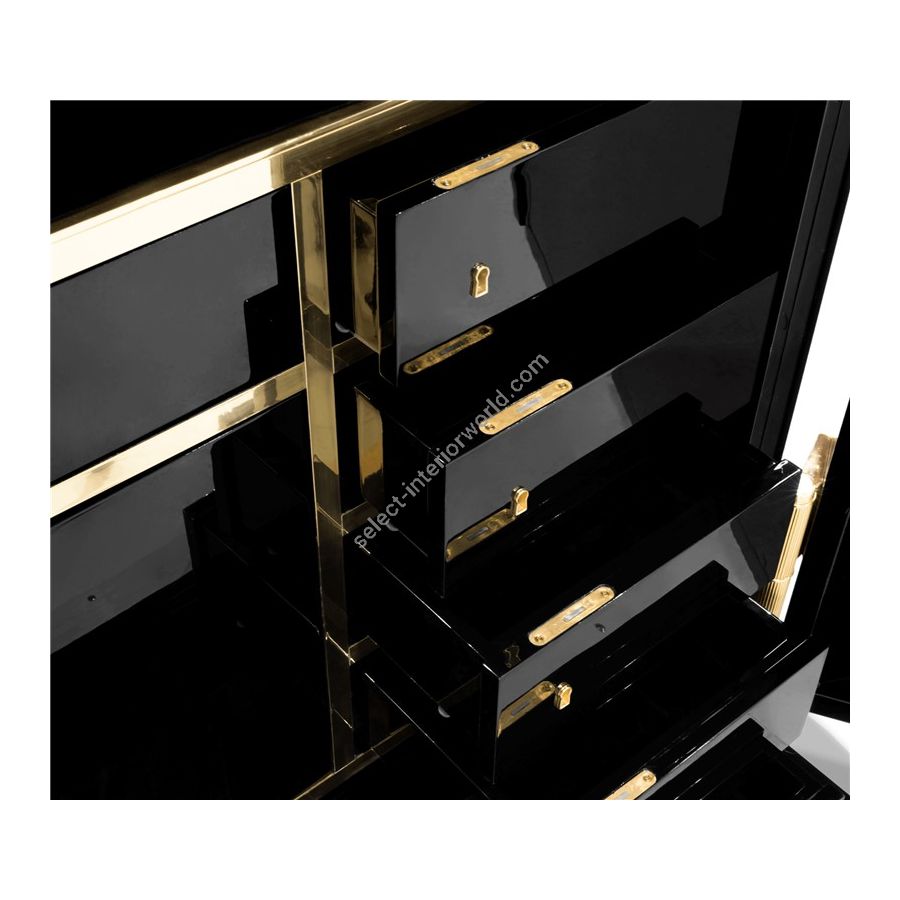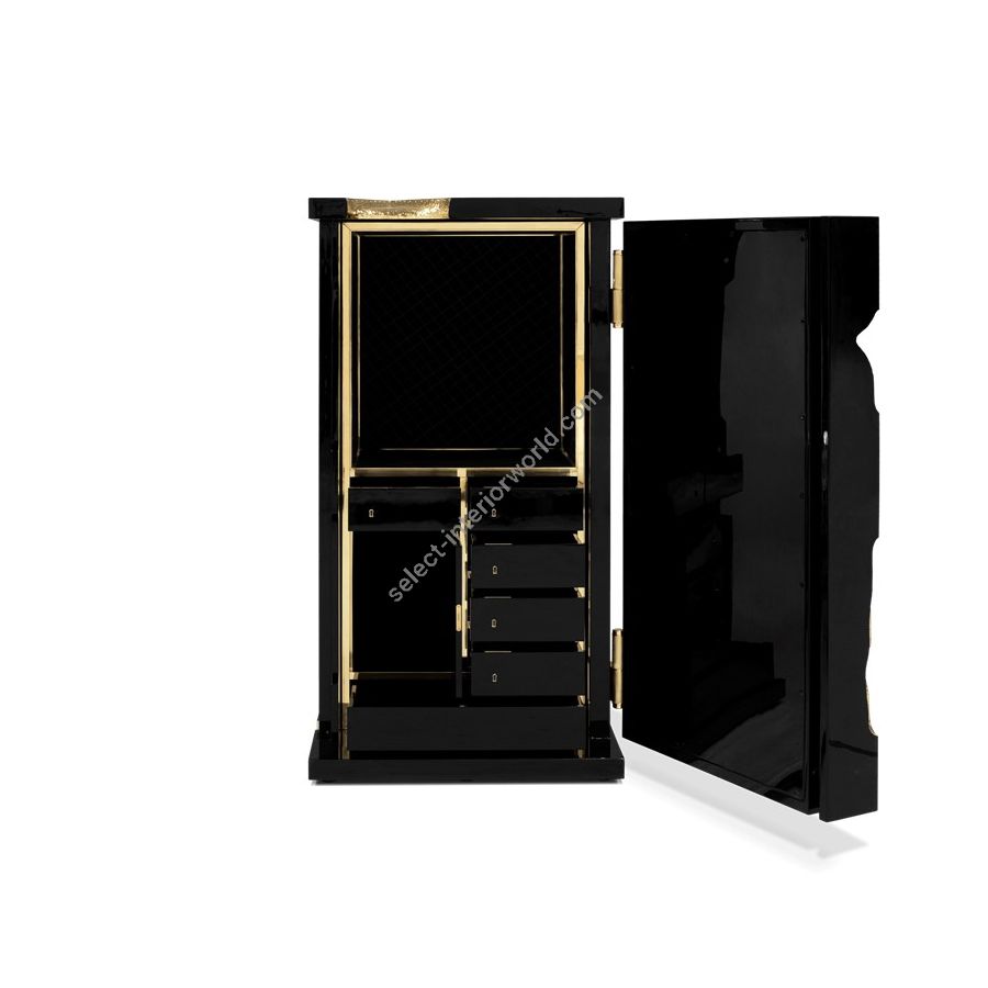 Wood structure, lined with polished brass sheets, with a black high gloss coat finish. Hammered brass handles and gold-plated wheels. Its opening system works with a secret code combination. The interior features a set of drawers and a door with a separate locking system.