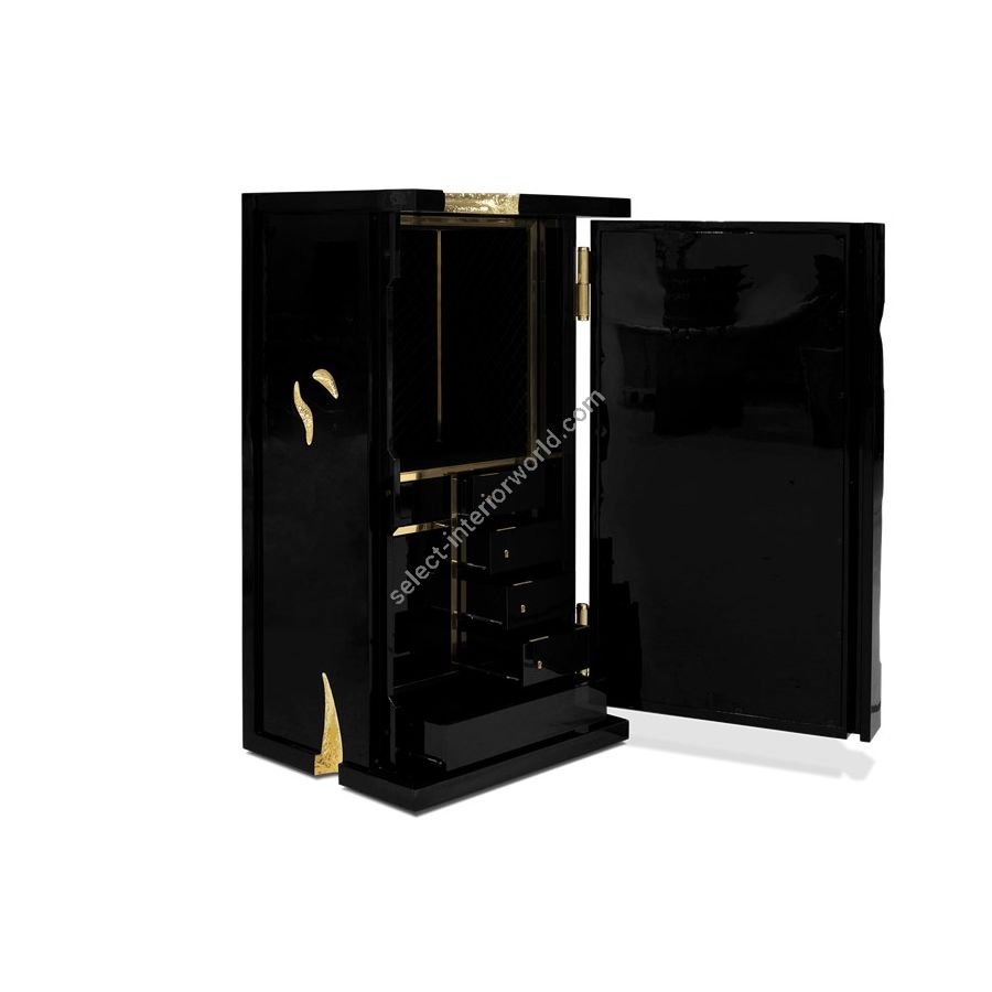 Influenced by the California Gold Rush, the Millionaire Safe is a statement piece designed to cause an impression. Enveloped by gold-plated polished brass frame with several dents, it sparks both interest and imagination reminding the vault robbery attempts in the old west. Nestled in a turned brass gold plated gear-wheel mechanism, an imposing safe handle obeys the will of is master through a secret dial lock combination. The overlay door makes room for an open space lined in velvet to keep liquors or other luxury lifestyle items, and a set of lockable drawers and door. Watch winders, shelves, an extra locking system and other features are able to customize.
