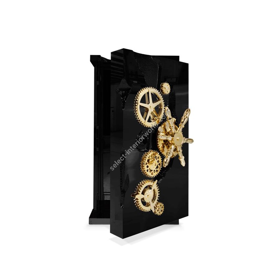 Influenced by the California Gold Rush, the Millionaire Safe is a statement piece designed to cause an impression. Enveloped by gold-plated polished brass frame with several dents, it sparks both interest and imagination reminding the vault robbery attempts in the old west. Nestled in a turned brass gold plated gear-wheel mechanism, an imposing safe handle obeys the will of is master through a secret dial lock combination. The overlay door makes room for an open space lined in velvet to keep liquors or other luxury lifestyle items, and a set of lockable drawers and door. Watch winders, shelves, an extra locking system and other features are able to customize.