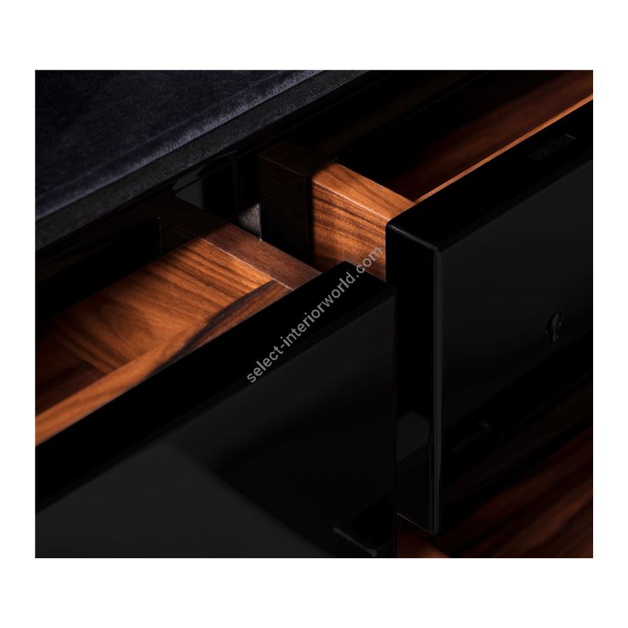 Wood structure, lined with polished brass sheets, with a black high gloss coat finish. Hammered brass handles and gold-plated wheels. Its opening system works with a secret code combination. The interior features a set of drawers and a door with a separate locking system.