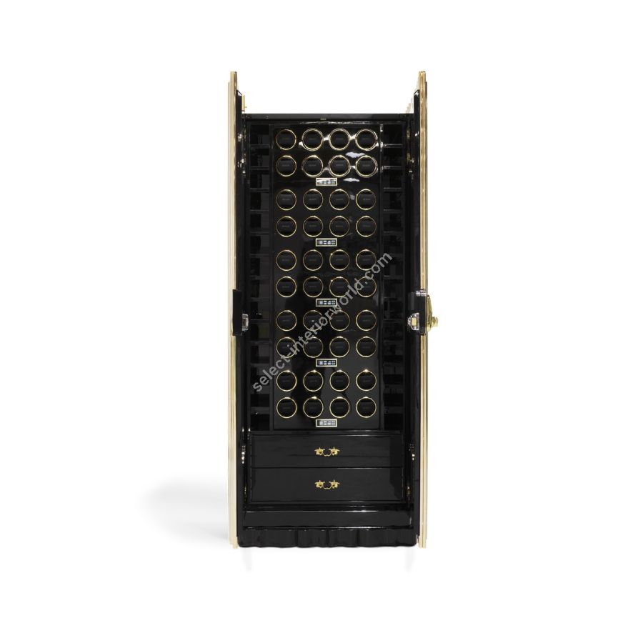 The Symphony Watch Winder Safe is a statement piece whose contemporary design emulates the grandeur of traditional church organ pipes. Crafted in an exotic wood body that’s enveloped in a tubular cluster of gold plated polished brass tubes, it features a pair of overlay doors that make way for a fully customizable interior, allowing fittings for multiple watch winder boxes. Each drawer is divided in three different compartiments for three different types of jewelry. Colars, rings and bracelets. All compartiments and covered are properly protected and covered with velvet. This is a stunning watch cabinet that brings music to the quietest of rooms, the Symphony keeps the precious items safe and impeccably organized