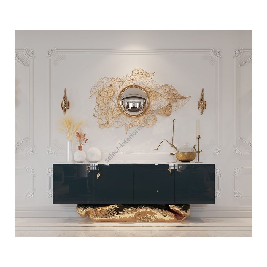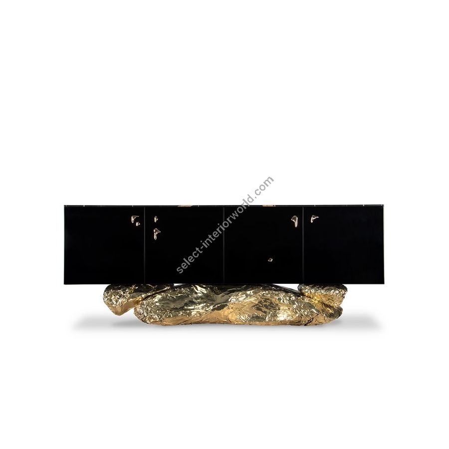 Bold yet elegant black and gold sideboard. The sharped body is fully covered in black high gloss, and it gently lies in an unexpected curved golden base conceived from hammered polished brass, inspired by the cliffs of the historical city of Angra do Heroismo in Azores island, Portugal.