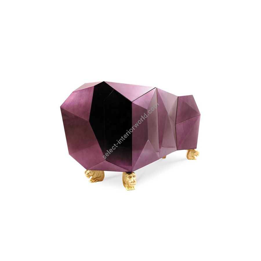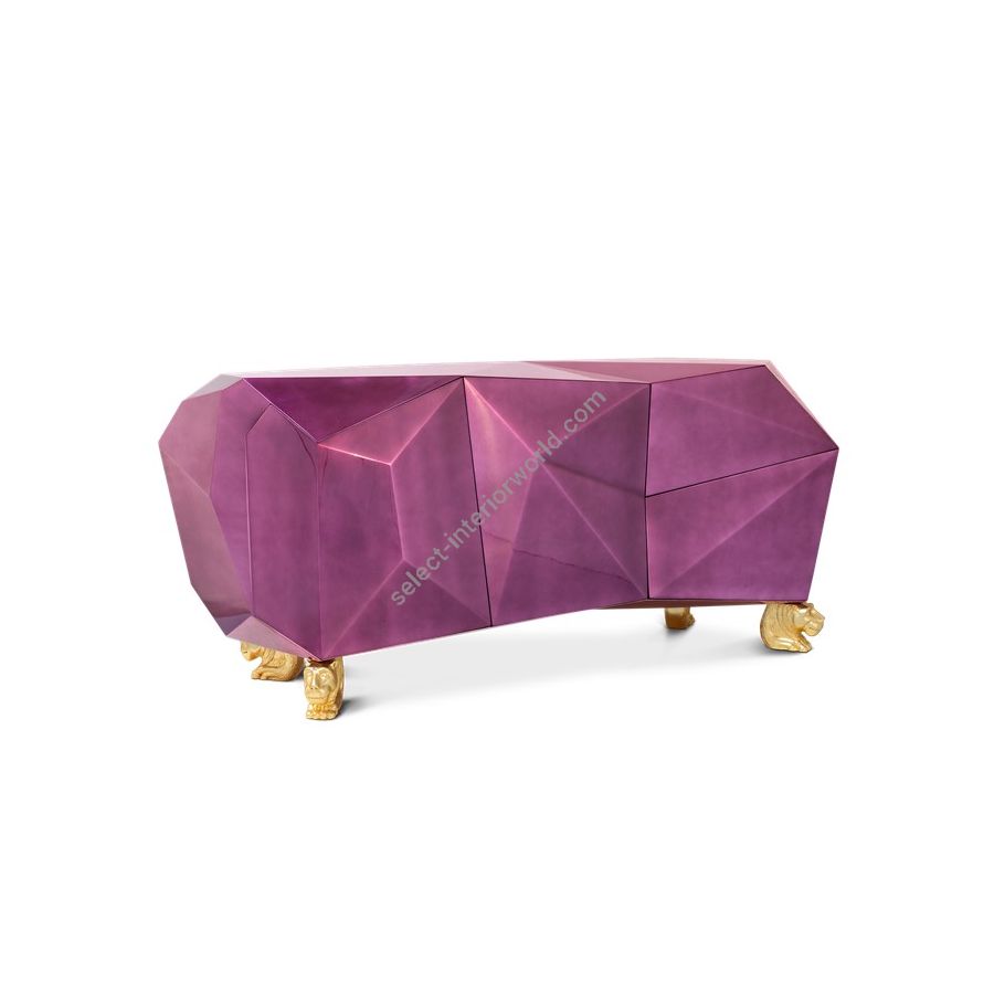 The faceted sideboard is covered by gold leaf finished with a distinct translucent shade of amethyst and high gloss varnish on top, while four hand-carved wood lion heads finished in gold leaf proudly support the body. It features two highly sculpted drawers and two doors, leading to a remarkable gold leaf interior. Layer by layer, leaf gilding is one of the most treasurable and richest crafts techniques. An unexpected way to give a timeless touch and to carry the legacy of those who built it.