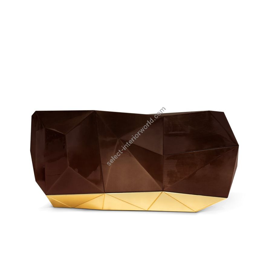 Faceted sideboard totally manually produced. Contains two doors, two drawers and a shelf. The interior is finished in golden leaf. Legs are manually carved lined with golden leaf. The sideboard is made from wood finished with a luxurious shade of translucent chocolate with high gloss varnish.