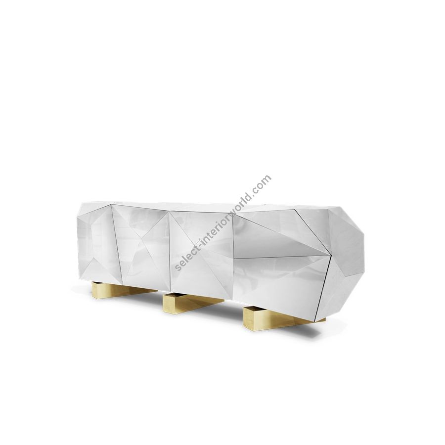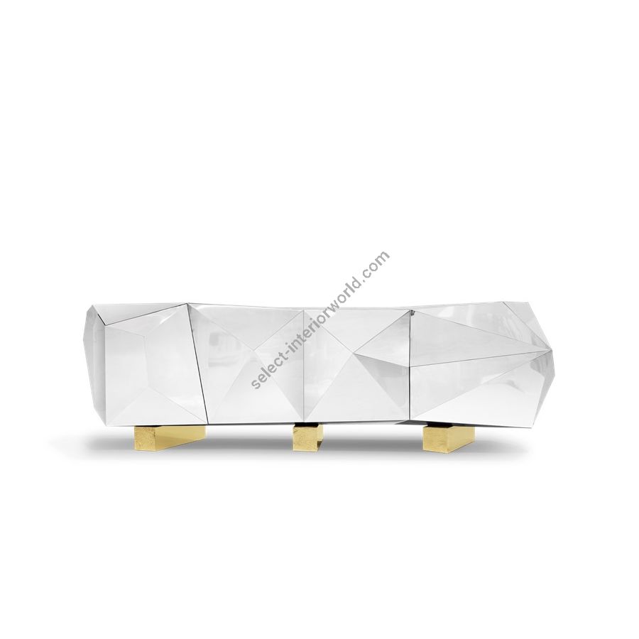 Time honoured masterpiece, the faceted Diamond sideboard is born as a subtle precious brown jewel with cutting-edge lines to challenge the boundaries of form. Influenced by the deconstructivism movement of postmodern architecture, the contemporary storage sideboard is conceived from wood and covered by gold leaf finished with a translucent shade of brown with gradient effect. It features two highly sculpted drawers and three doors, leading to a remarkable gold leaf interior and one shelf. Layer by layer, leaf gilding is one of the most treasurable and richest crafts techniques. An unexpected way to give a timeless touch and to carry the legacy of those who built it. The strong geometric design is coupled with three brass plated feet with casted brass details. A real expression of exclusivity and high collectible design.